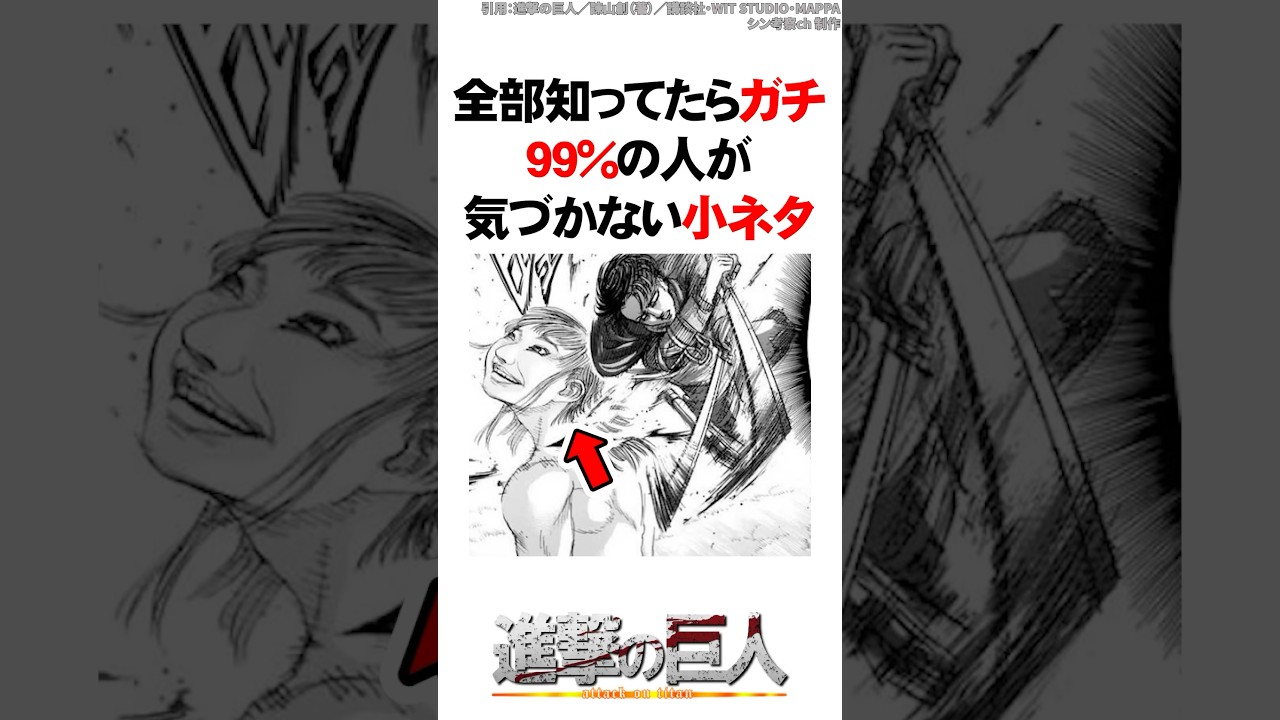 Share Facebook Twitter Pinterest LinkedIn 全部知ってたらガチ!99%の人が気づかない小ネタ【進撃の巨人】 #Shorts 今回は全部知ってたらガチ!99%の人が気づかない小ネタを解説します! <引用元> 進撃の巨人 (著)諫山創・講談社/「進撃の巨人」The Final Season製作委員会 #進撃の巨人 #shorts animeアニメドラマアニメ進撃の巨人