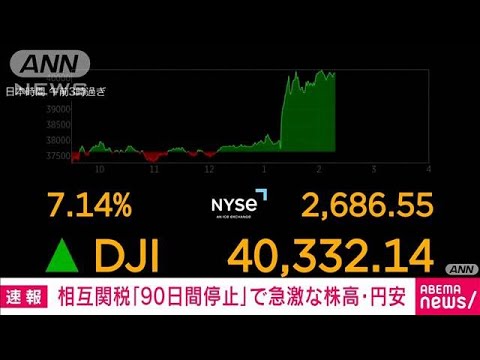 アメリカのトランプ大統領が「相互関税」の上乗せ分について発動を90日間停止すると表明したことを受け、マーケットは急激な株高・円安の動きになっています。
