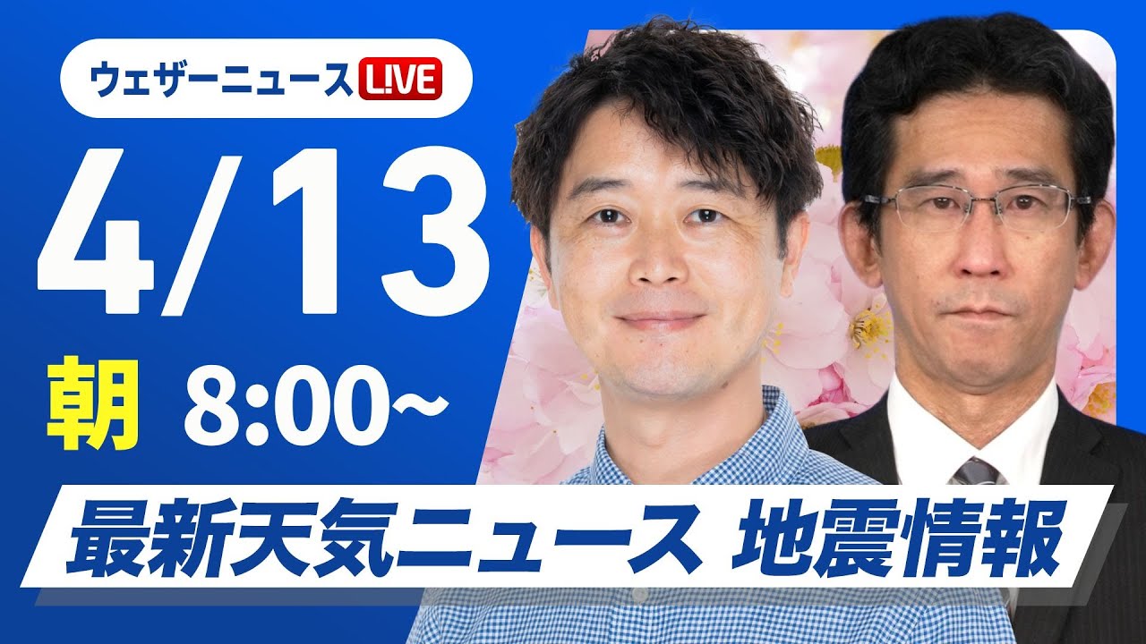 【ライブ】最新天気ニュース・地震情報 2025年4月13日(日)/広範囲で雨 局地的に強雨や雷雨のおそれ〈ウェザーニュースLiVEサンシャイン・川畑玲/山口剛央〉