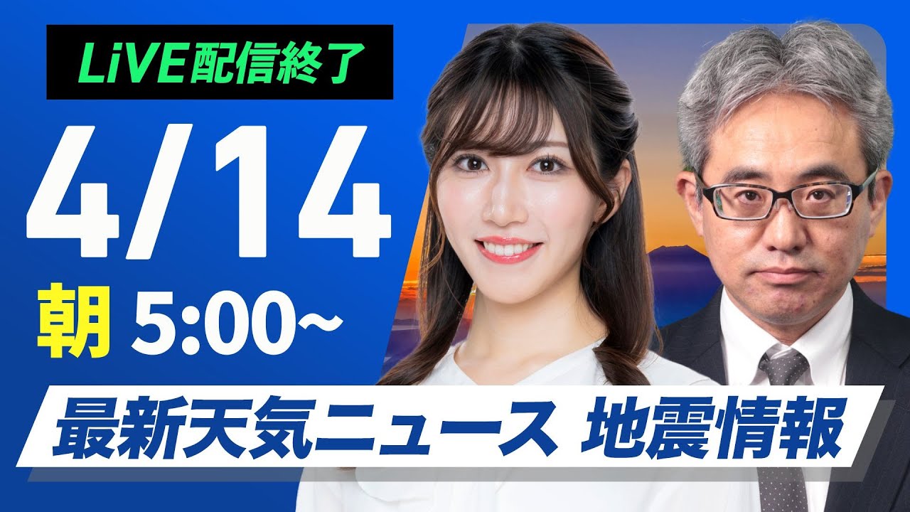 【ライブ配信終了】最新天気ニュース・地震情報 2025年4月14日(月)/西日本で雷雨のおそれ 北日本も風雨強まる〈ウェザーニュースLiVEモーニング・魚住茉由/本田竜也〉