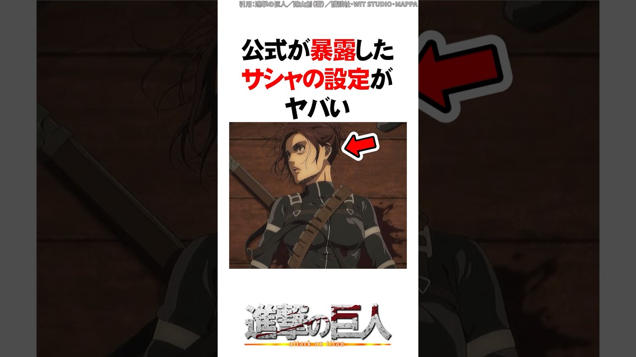 Share Facebook Twitter Pinterest LinkedIn 公式が暴露したサシャの設定がヤバい【進撃の巨人】#Shorts 今回は公式が暴露したサシャの設定がヤバいを解説します! <引用元> 進撃の巨人 (著)諫山創・講談社/「進撃の巨人」The Final Season製作委員会 #進撃の巨人 #shorts animeアニメドラマアニメ進撃の巨人