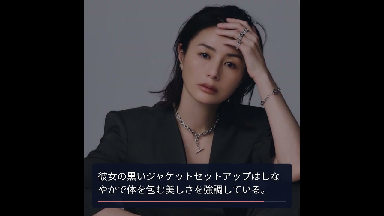 女優の井川遥がインスタグラムで新たなスタイルを公開し、絶賛の声が寄せられている。,シルバーのチェーンと黒い衣装のスタイルが彼女の美しさを一層引き立てている。,新作のチェーンジュエリーは、エッジの効いたデザインでジェンダーレスの魅力を放つ。,彼女の黒いジャケットセットアップはしなやかで体を包む美しさを強調している。,フォロワーたちは彼女のスタイルに「凛とした女性になりたい」と称賛の声を上げた。,彼女のファッションにはエレガントさと美しさ、そしてカッコよさが融合している。,井川は1999年から芸能界にて活躍し、数々のCMやドラマでその存在感を示している。
