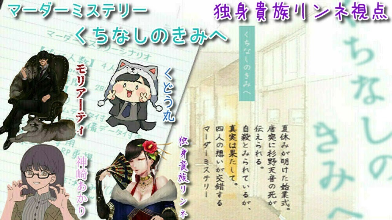 独身の道は覇道の道ぞ マーダーミステリー 皆で紡ぐ物語ー。※物語に関する投稿は固く禁じられている故、感想をSNSに載せる際には厳重注意が必要だ。 気をつけるのじゃぞ。『くちなしのきみへ』 販売先URL作者わたみ殿 ゲーム配信人狼君は彼方独身貴族リンネ