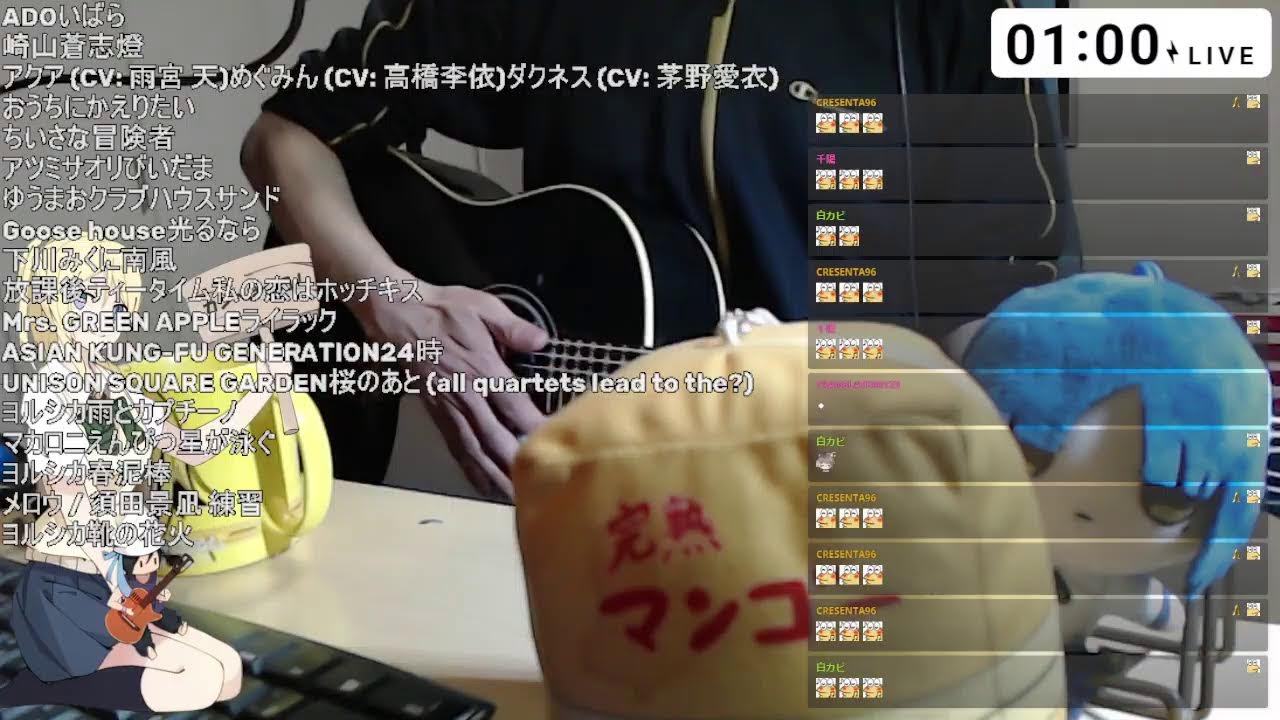 I broadcast singing Japanese anime songs and j-POP with a guitar.