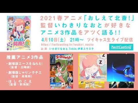 Share Facebook Twitter Pinterest LinkedIn 2021春アニメ「#おしえて北斎!」 監督いわきりなおとが好きなアニメ3作品をアツく語る ・劇場版エースをねらえ! ・劇場版じゃりン子チエ ・ほしのこえ お時間ありましたら是非! #出崎統 #高畑勲 #新海誠 おしえて北斎! -THE ANIMATION-