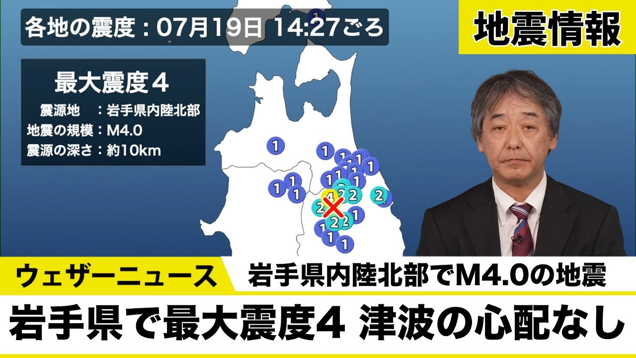 7月19日(金)14時27分頃、岩手県で最大震度4を観測する地震がありました。