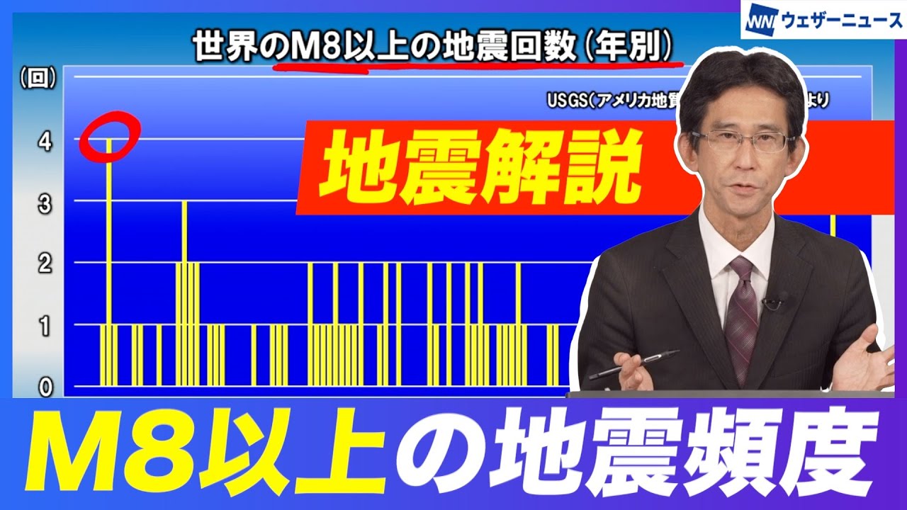 え、日本時間の昨夜ました南米沖きの 大きな地震の続報となります。え、地震が 起きましたのは日本時間の昨日22時前の こととなります。え、信源が赤いバ印です ね。ドレーク海峡と行います。え、南極と 南米南アメリカの間の海峡となりまして マグニチュードが7.5。え、大変大きな 地震でした。ま、この地震に伴いまして、 え、津波が発生をしておりました。え、 PTWCハワイの太平洋津波警報センター によりますと、南極半島の、え、 ベルナドスキーの観測点で日本時間の今日 午前0時1分に14cmの、え、津波を 観測しました。一方でそれより、ま、津波 は高くなってはいなかったということで、 ま、日本時間の3日1時1分、今日の1時 1分に、ま、津波の恐れはなくなったと 発表しております。で、このドレイク海峡 付近なんですけれども、詳しい新源の位置 見てみます。え、こちらがUSGs アメリカ地質調査書のホームページの、ま 、進源のマップになります。南米ですね。 チ里アルゼンチンのもう最難のさらに 置き合いとなります。ご覧の通り、ま、 これ昨日の日本時間の夜の地震から多数の 、え、余心が、え、発生をしている状況と なります。ま、ご覧の通りですね、 マグニチュード5クラス、6クラスといっ た余心も、え、発生しておりまして、ま、 地震活動今持っても結構活発な状態が続い ています。で、このトレーク解の辺りなん ですけれども、え、これがですね 、ま、USGS の書いているもののうち、今引いている 赤い線、これがプレート協会に当たって おります。で、こちらが少しプレートと 呼ばれます。日本付近にありますプレート などに比べると、ちょっと小さめの プレートであとこちら側に広がるのがこれ が南極プレートと呼ばれるものになります 。え、今回の地震はそのスポシアプレート と南極プレートの、ま、境界付近で起きた タイプでして、ま、岩板がこう上下にこう 変化するタイプでしたので、ま、小さい ながら津波も発生をしたということになり ます。で、このドレーク海峡付近、今回 ほどの大きな地震の発生というのはですね 、比較的珍しいです。この辺り近くですと 1910年にマグニチュード7.1の地震 が起きたという記録があるんですが、ま、 それ以外にこの付近では7クラス以上の、 え、地震というのは、え、1901年以降 では観測されておりません。ま、今回の 地震はドレク海峡北区部ですとね、最大級 の地震だったということになります。ま、 こういった形で、ま、昨夜、ま、大きな 地震が発生したんですけども、 人口低住車のあるような、え、人口を持つ ような、ま、町からはかなり離れたところ で起きた地震でした。え、特にですね、 揺れも大きくはなっていない模様ですので 、え、津波も低く被害の発生はなかった ものと見られます。え、そ、こっちですね 、その今回起きたわけなんですけども、ま 、今年に入ってからも、え、そうですね、 2月に仮深でマグニチュード7.6の地震 だったり、え、3月の方下旬には ミヤンマーでマグニチュード7.7。これ も甚大な被害出てますね。そして、ま、 日本時間の昨日のマグリチュードが7.5 の、え、地震が起きたりと、ま、地震活動 はね、かなり活発な点をね、え、皆さんも 意識されてるかもしれません。ただですね 、地球規模で見ますと、マグニチュード7 以上の地震というのは1901年以降で 1534回、つまりこの125年間で 1534回ですから1年あたり大体12回 起きてるんですね。ま、この4ヶ月ぐらい での、ま、3回4回ぐらいの7以上の地震 ですから、決して、ま、特に多いわけでは ないんです。その一方でですね、もう 1回り大きな地震、マグニチュード8 クラスの地震というのはね、実は最近 あまり起きていないんです。このお話を ちょっとしたいんですけれども 、え、こちらですね。これがですね、この USGSアメリカ地質調査書の、ま、 ホームページのデータをちょっとまとめた ものになります。地球上で起きた マグニシュド8以上の、ま、地震の年別 回数を示したものになります。で、191 年から、え、この観測統計が残っているん ですけども、ま、多い年ですと マグニチュード8以上の巨大地震4回起き ているんです。最近ですと2007年です ね、1年4回起きた年がありました。この 年はインドネシアですとかね、シマレット での地震ですね。で、かなり多い年は4回 ぐらい。ただ起きない年はもう0回って いうのがこれも何回もあります。一方で 最近ですと2022年ぐらいからですね。 22年ぐらいからこの3年間ぐらい、え、 起きていないということになります。で、 過去を見ますとこの辺り1985年 からえですね、77年から85年にかけて 7年半にわたって8以上の地震がなかった 時期があったんですけども、これはね、 例外的に長かったです。他を見ると長くて もやっぱ34年で間もその後起きてるん ですね。今大体3年ぐらいもう マグニチュウド8以上の地震最近起きて おりませんとなってきますと、ま、どこで 起きるかってのはね