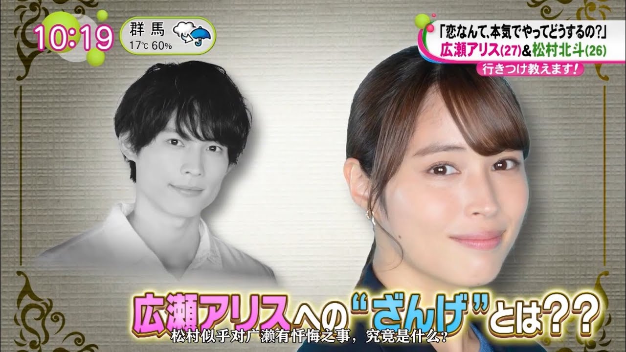 本日の行きつけを教えます。ゲストは その時にしかダメなことがあるっていうか私にはすごく分かるんです。 [音楽] 多くの役を演じるだけでなく バラエティ番組などで見せるその語らない人柄も人金の [音楽] 女優瀬アリスさん。 今月ギガ使ってないのに同じスマホ台なんですよ。 ここはポボ。え、 スマホ台はちびの思い通りにコントロール。 基本量0 円から使う分だけでOK。 自分で作るスマホプラン。 これがポ 花のある存在感と愛らしいキャラクターで CM 出演数も多数。今やテレビで見ない日はないほど大活躍している。 そしてもう1人のゲストは 人気グループンズのメンバー松村北斗さん。色気あるパフォーマンスでファンを魅了する一方でフットネ 1つ買ったらレモン2倍だって。 じゃあ2つ買ったら 同じじゃん。レモンカ 2イタリアンレモンアジ ブルボンフェットチーネ組じゃあ10 個買ったら CM で見せるその愛らしい表情も魅力の1 つ俳優としても活躍し朝ドラでの演技が話題になったばかりそんな人気者の 2 人が今夜始まる月獣ドラマ恋なんて本気でやってどうするので共演なんて人生のとい 恋愛0の主人公を演じる瀬さん と来るもこまず去るもの追わず切主義者の 松村さんが大人の本気の恋に挑みます。 撮影でも息ぴったりの2人のはずが松村 さん広瀬さんへの残があるそうなんです。 一体何 ?さらに2人がこれなく愛するあれについ て熱く語る 。この後最も旬な2人の魅力を大公開。 [音楽] 行きつけ教えます。 さあ、行きつけ教えます。本日のゲストは今夜から始まる月ドラマ。恋なんて本気でやってどうするのから広瀬有さんと松村北斗さんにお越しいただきました。 よろしくお願いします。 お願いします。 さて、今回のドラマでお2人は2 度目の共演ということなんですけれども、松村さん、広瀬さんに謝っておきたいことがあるそうなんです。 謝りたいこと。それが 撮影中実は名前を1 度も呼んでいなくてごめんなさい。 え、ど、どういうこと?これは あの、まあ9年前、10 年前ぐらいに共演した時は、ま、同じシーンも多くて結構仲良かったんですけど。 うん。うん。うん。でもその10 年ぐらいの時を経て 色々忘れてしまったんですよ。 何を話したかとか のついでにうん。 なんて呼んでたかわからなくなってしまって 分かるわ。それ清瀬さんなん 久しぶりにあったらどんな感じだったかわかんなくなって逆に呼べないってやつでしょ。 そうなんですか。ええ。 なんか当時あのお互い高校生ぐらいだったんで あだ名の可能性もあるしアリスちゃんとか広瀬さんとかもあるしうん。うん。 [音楽] わかんないなと思って出しで なん々にしてったら最終的にあの1 度も呼ぶことなくえも今もえですか? それは気づいてました?呼ばないなっての? え、気づいてました。あ、気づいて。え、 呼ばないなと思ってて、で、北斗君が結構あだ名で呼ばれてたんですよ。現場で。 うん。うん。うん。うん。 で、そういえば呼ばれてないな、ま、いっかみたいな うん。うん。うん。 感じでかねえねえとか、あのさとか へ、あ、あのさとかえ、君はねえとか これでもさ、ある程度また再開して時間が経てばまたちょっとこう距離感も縮まってくるからごめん。実はさ、ちょっと呼び方な何て言うんだか忘れたんだけどな何て言うんだったっけっていうことも聞けなかったの。 うん。それもなんか気まずくなっちゃって。 え、な、何て呼ばれてたか覚えてます? 私多分9年前も呼ばれてない。 年前呼ばれねとか呼んでこ の中でお前さとかみたいなのはあった気がするんですけど あんまりそんなに呼ばれてた呼ばれ方が思い出せない いですね。 じゃもここで決めちゃえばその方がだってまだ また撮影あるでしょ。 そうね。そうですね。だ今後また共演ってことも全然あると思う。 うん。 うん。だ忘れないようなのにしといたら したらもう広瀬さん いやいやいやだいぶ距離ありますから。 まあね、ま、それが間違いないんだけどね。 間違いないけど距離ありますよ。 でもひろ瀬さんの場合はあの姉妹でやってるから 2 人と一緒になった時にそれだとあるからね。 名前のアリスさんの何かをもじった呼び方の方が そっか先輩盲点すぎました。今のは 盲点すぎた。先輩 だから何友達からは何て呼ばれることが多いんですか? ま、基本的にはアリスとかじゃあもうアリスでいいんじゃない? [音楽] ああ、じゃあアリスさんで そう呼び捨ね。 そっかアリスさん、なんかちょっと ちょっと距離はね、ある。でもあります。 1個私地元一緒なんですよ。静岡 出身で私1個上なんですけど。あ、 だから先輩。 ああ、 すごい言うんですよ。現場で 先輩って思って地元の先輩まあまあ だと思ってほしい。 ああ、したと思ってほしいって言われてもね。 なんか呼び方忘れた流れでなんか忘れてって同い年だもんねって言ったら 1個目だから。 そね。ちゃ、ちゃんとちゃん。 これマウント取ってたら急に1 個目だから。地元一緒一緒先輩だから