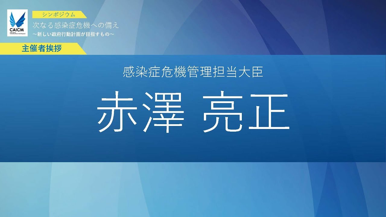 開催にあたり主催者を代表して赤沢亮政 感染症危機管理担当大臣よりご挨拶 申し上げます [音楽] 皆様こんにちはえご紹介をいただきました え衆議院議員の赤沢亮政でございますま 現在え感染症危機管理担当大臣を務めて おります え防災はめ危機管理をライフワークとする 政治家でございますえ過去にはですね え内閣府の匿名担当副大臣としてえ新型 コロナの担当してたこともございますま 今日あのリモートでご参加ということだと 思いますがえ福井県知事の杉本知事とは 当時ですねえ飲食店の第3者認証制度を 入れようと蔓延防止にはこれをやるしか ないというようなことでですねえ一緒に その制度の導入に努めた中でありましてえ 今日はあの戦友のお顔が拝見できるかと 思ったらちょっとリモート参加ってこと でしたがま聞いておられるかと思いますえ 本当当機管理はあの関係者が総力上げて 取り組まなきゃいけないものでありますん でえしっかりまチームワークよくして 取り組んでいきたいものだという風に思っ てますで今日は内閣感染症機管理当課長 主催のシンポジウムにえ本当に多くの皆様 にご参加をいただいて感謝を申し上げます え目の前におられる皆様だけでもま50人 は超えてると思いますがあネットでご参加 されてる方が1600名を超えていると いう風に承知をしてますざ数字を見せてい たいくとえ公務員の方が700名長え医療 従事者の方が約300名ということであり ますえそして会社員の方が約500名と いったことでえそれ以外にもま自営業 あるいはあの主婦ですねえ夫と各かあの 夫人の各かあれですけどあるいは生徒学生 さん本当に多彩な参加者を迎えられて大変 嬉しく思っておりますで私自身まコロナ 担当の副大臣冒頭申し上げました通り経験 しましたががえ新型コロナウイルス感染症 との長い戦いにおいてですね医療従事者を 始め国民の皆様お1人お1人の本当にご 協力をいただきましたまみんなで不自由に あるいは不安に耐えたわけでありますま 国難とも言うべき事態を乗り切ることが できた本当に全ての皆様のおかげ様だとえ 全ての国民の皆様に心からの感謝の気持ち をここで表明をしたいと思いますえ次の 感染症危機はいつ発生するかが分かりませ んえ有次の際にえ国民の命え身体これ守り にくためには平時から準備を行うことが 必要不可欠であります平次に十分な備えを しえ有事への移行をスムーズにするとえ このためにはま新型インフルエンザと対策 政府行動計画というものについてえ昨年7 月2013年の策定以来約10年ぶりに ですねえ初めての抜本的改定を行いました え計画については作ってお終わりにする ようなことがあってはなりませんえ国やえ 自治体えの取り組み等について確実に フォローアップを行って必ず起こるこれは もうあの起こるか起こらないかじゃなくて 起こることは確定してるんだがいつかと いう次の感染症危機に対しですねえ強靭な 社会を作って参りたいと思っており ます昨年11月には新型インフルエンザが 海外で発生をしえその後国内で初めてが 発生したとの想定でですねえ島政権の元で 初めてとなるえ訓練を実施をいたしました え総理の元にえ関係省庁の閣僚が集まる 政府対策本部介護えそしてえ47都道府県 に参加いただく緊急連絡会議を開催をしえ 感染症有事の所動対応を確認することが できましたえこの他にもえ空港や自治体で の訓練などもお順次実施をしております え加えて訓練を通じて見えてきた課題への 対応も重要ですえ具体的には感染症危機時 にえしっかりとした時間軸を持って 取り組みの進捗を確認しつつえ国や都道府 県え国立感染場研究所などの関係機関え さらにはえ今年4月に設立されるえ国立 健康危機管理研究機構とえジスと略称 いたしますが連携して円滑な所動対応が 可能となるようえタイムラインの制を進め え対応の充実を図ってまいりますえ本日の シンポジウムではえ次なる感染症機器への 備えよテーマにえ全面改定した新しい政府 行動計画の内容をえ皆様にご紹介すると ともにえ様々な立場の有識者の皆様にえ 現在の対応状況やえ今後の課題などについ てえご議論をいただきたいと思いますえ 本日のご議論が国民の皆様にとってえ次の 感証を聞きに平次から備える意義及び 取り組むべ課題についてご理解を深めて いただくえ絶好の機会となることを強く 記念をしておりますえそれでは私のご挨拶 は以上となりますがえ本日はどうぞ よろしくお願いをいたし ます赤澤大臣ありがとうございました