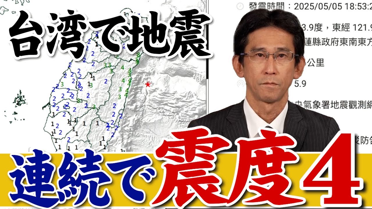 え、日本時間の今日19時過ぎからなん ですけれども、台湾で地震が相ついでい ます。え、震度4の地震がすでに3回起き てる状況です。え、そのうち最も大きかっ た地震、こちらご覧ください。え、こちら は台湾中央気象書のホームページで、え、 公開されているデータになります。え、 このような形で、ま、これ現地時間ですが 18時53分、日本時間で19時53分に 起きた地震です。で、規模の方ですけども 、ここに、ま、類子規模となってますね。 これがリヒタースケール、つまり マグニチュードを意味しておりまして、ま 、台湾中央気象マグニチュード5.9の 地震が起きたと法しております。え、震度 の分布図持っておりますけれども、え、 ご覧の通りですね、 こちら台湾の東の海場に信源があります。 え、信源に近いカレンなどで震度4の揺れ を観測した。とか、え、台湾のほぼ前度で 揺れを観測しました。え、これが日本時間 19時53分頃の地震です。で、これより 前の日本時間の19時9分頃には マグニチュード5.5、え、信源の深さ、 ま、比較的浅いところで震度4の揺れが あった。他も10、日本時間のですね、 20時15分頃、日本時間の20時15分 頃にはこちらの辺りでマグニチュード 4.3、やはり震度4の地震が発生して おります。ま、台湾の東側で日本時間の 今夜に入って地震が相ついでいるんです けども、こちらは今度はUSGSアメリカ 地質調査書のホームページです。え、新源 の位置2つ出ておりますけども、これが、 ま、日本時間の19時代に相ついでおきた 地震の信源です。そして2024年、去年 からの地震の信源を重ねますと、こちらに なります。ま、この辺りにグレーで、ま、 表現されている、集中しているエリアが あるんですけども、これがですね、去年の 、ま、4月ですねにマグニチュード、え、 ま、USGSは7.4としております けれども、日本の気象庁はマグニチュード 7.7としております。ま、王子地震が、 え、発生しました。で、今日起きてる地震 はそっから少し離れたところにありまして 、ま、今のところ直接的な関係はないかと 見られますけども、え、一方でですね、 この1時間半ぐらいの間で、ま、震度4 以上の地震相ついでおりますし、ま、最初 の地震よりもですね、先ほどご覧いただい たこちら、え、この19時日本時間です。 53分頃の地震がマグニチュード5.9° ですね。最初の地震よりむしろ大きくなっ ております。もう少しこの台湾等眼の地震 が、ま、続く可能性もあります。ま、今の ところ日本国内では、ま、揺れの方は観測 されておりませんけれども、ま、この後、 ま、台湾、え、エリアの、え、地震活動に は、ま、注意が必要ということになりそう です 。え、最新の国内の地震情報ですとか、 海外の地震に関するニュースについてはお 天気アプリウェザーニュースでもご覧 いただきます。