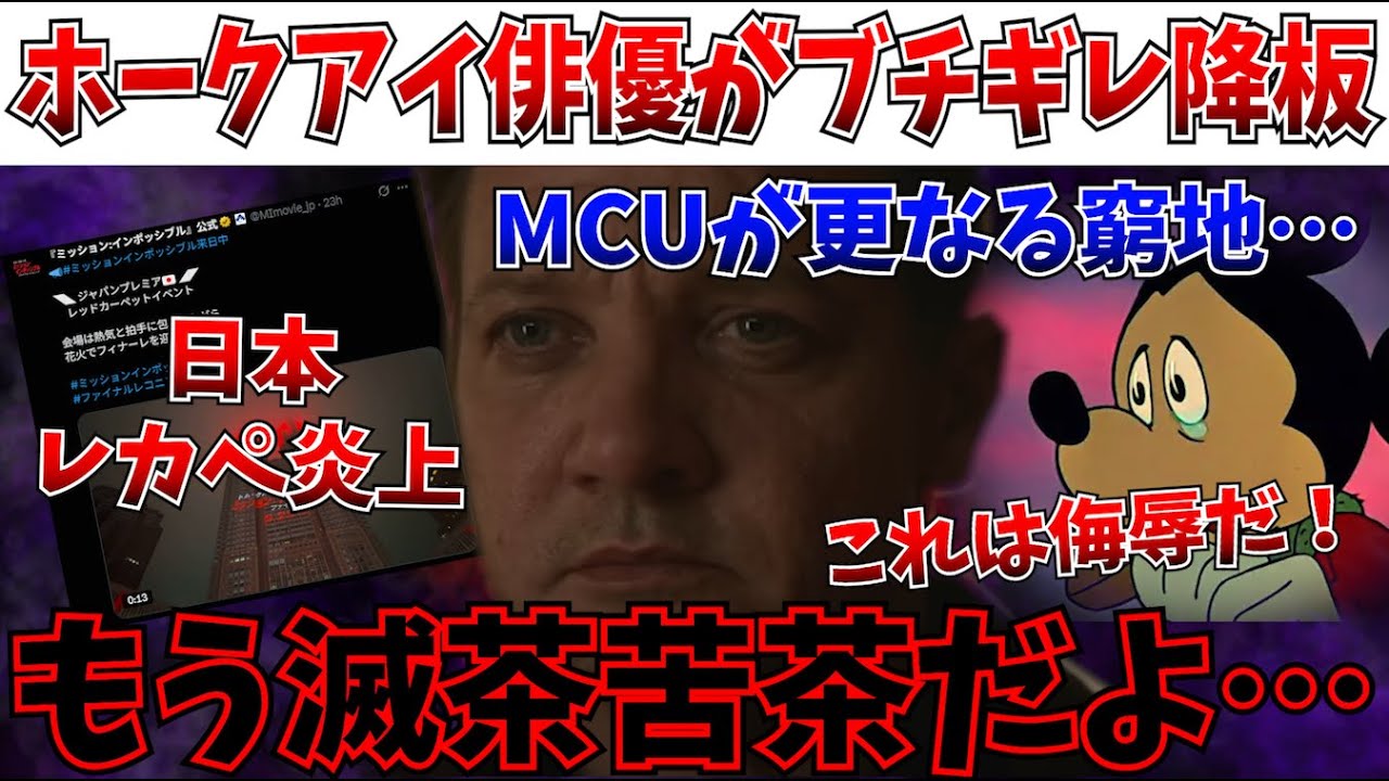 分離主義勢力の諸君ご機嫌よ。行かれた 動画にようこそ。ここは地獄だ。さて、 今回の日産話だな。MCUに関してとてつ もなく悲しいニュースが舞い込んできた件 とミッションインポシブルの日本のレッド カーペットが炎上している件、これらに ついてこのIQ2.69兆の俺様が語って いこうと思うぞ。お前ら耳の穴かっぽじれ 。一体全体何がどうなっているのかという とだな。まず最初にだ。サンダーボルツが 苦戦中のMCUだがさらなる秘宝が 舞い込んできやがった。ホークアイという ドラマをお前らは知っているだろうか。 そうだ。ディズニープラスにて配信された ホークアイを主演としたドラマシリーズだ 。これのシーズン2が進行中であることは 以前もこのチャンネルでお伝えしたよな。 そのホークアイシーズン2にホークア役の ジェレミーレナーが復帰しないことが 明らかとなってしまった。来人男祭りに 朝倉ミクると平本レンが出ないぐらい やべえ事態だ。ま、平本レンは出なかった わけだがともあれだ。大ク役でおな染みの ジェレミーレナーによるとシーズン1の 半分のギャラしか提示されなかったため 出演のオファーを断ったと明かした。 シーズン2の出演以来が来て報酬は半額 だったんです。でも半分の報酬で2倍の 仕事量そして実質8ヶ月も拘速されるんだ から半分のギャラで済むっていうのは さすがにねといった具合のことを ジェレミーレナーは口にした。レナー曰く これは侮辱的なオファーとのことだ。今後 はホークアイなしでホークアイシーズン2 をやると予想されている。ケイト ビショップが主人公でホク合はなしという 流れだろうか。うーん。まあ1つ言える ことがあるとすればだ。とてもじゃないが 正気の沙汰とは思えないってこったな。 ホークのいないホークアイなんて ドラえもんのいないドラえもん夏休みの ない8月笑うことのないサンタクロスと いった具合の事態だよな。いくらなんでも これはあまりにもあんまりすぎるのでなん とかして欲しいところだ。あ、一方でだ。 この、え、オファーを蹴ったジェレミー レナーに対して金の毛もめなどという声も 一部ありそうなので、ちょっとそこら辺俺 が全力でこれからジェネミーレナーを擁護 させてもらうぞ 。正当な主張。金に汚いなどというやも いるだろうが、これは当然の権利だ。害な キャラを要求したとかなら分かるのだが、 突然成功したプロジェクトの第2弾でお前 の給料は半分だと言われている状態だぜ。 社会人ならこれがいかになめ腐ったことか 理解できるはずだよな。あー、俺だって 企業案件でいきなりギャラを半分にされ たら余裕で断るぜ。基本的によく考えて 欲しいのだが、興味があって好きな案件 しか俺は受けないようにしているのだが、 それとこれとは別だ。いくら興味のある 案件だからと言って前回うまくいっていた にも関わらず今回はギャラが半分です なんて言われたら舐めてんのかってなっ ちまうだろう。これは人間感情として当然 だよな。自分を軽視されていることが問題 なわけだ。いいかお金自体が問題なのでは ない。自分のことを明らかになめ腐って いるという点が問題ってわけだ。自分の 価値を自ら下げても何らいいことはないっ てことはお前らとて分かっているだろう。 ジェレミーレナーとホークは好きだと言っ ている。その上でだ、半減した侮辱的な ギャラで承諾するわけにはいかないという スタンスだ。レナーはさらにこう続けて いる。ごめんなさい。どうして?うん。 引かれたからジェリミーの半分しかないと 思ったの。だから最初のシーズンの半分 しか払われないのって感じでしたとのこと だ。これはレナーが車に引かれてくりかけ た件からの引用だろう。マジレスすると ディズニーとしてはだ、ストリーミング 部門に対するコストカットを実施している 。その件に関してはこのチャンネルの視聴 者であれば、あ、誰もが知っていること だろう。ああ、そうだ。今までは ディズニープラスにアホみたいに金を ジャブジャブ継ぎ込んでいたわけだが、 うーん、さすがにちょっとディズニー プラスは赤字が多かったりもするし、予算 を継ぎ込みすぎていたという側面があるの で、コストカットをしていこうという動き があるわけだな。それを踏まえて考えると ホークアイのシーズン2もなるべく予算を 抑えたいというディズニー側の思想は理解 できる。ちなみにホークアイのシーズン1 には推定ではあるのだが1.5億ドルの 予算が投入されている。シーズン1の視聴 回数が良好だったならシーズン2では むしろ予算を増やせと思うかもしれない。 しかしぶっちゃけた話をするとだ。当時と 今とではMCUの状況も違うしディズニー を取り巻く状況も違う。仮にホークアイの シーズン2をやったとしてぶっちゃけ シーズン1より低い視聴回数になることは 目に見えている。デアデビルの状況を見れ ば分かるはずだ。いかに少ない予算で安定 した視聴回数を取れるかが重要って