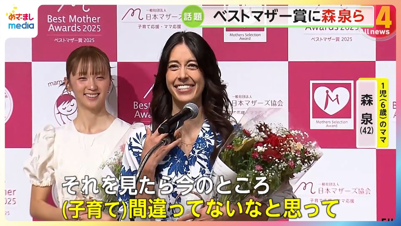 母の日を前に芸能会などで活躍するマたちが受賞です。 今年で17 回目を迎えたベストマザー賞モデルの森泉さん、歌手のドリームアみさんだが受賞の喜びを語りました。 先輩ママさんたちのあの子育てされている様子などからもたくさん学ばせていただきながらも私は私にできることを全力でやれるお母さんになりたいと思っています。これからも母親として 1 人の働く女性として自分らしく歩んでいきたいと思います。 おめでとうございます。 森さんは今年小学生になったマの成長を感じているようで、 [拍手] 私、あの、ワンちゃんが8 匹いるんですね。それで娘にこれぐらいのお肉があって 1 番好きな子にあの内緒であげていいからねって言ったらすごく細かく発分してみんなにあげてったんですよ。た、それを見たら今んところね、間違えてないなと思ってハッピーになりました。 最後まで動画をご覧いただいた皆様本当にありがとうございます。 ありがとございます。 この動画へのいいねやコメントそしてチャンネル登録を是非よろしくお願いいたします。 お願いします。こっちこっち。 フジテレビアナウンサーカルベ新一と 井上成でした。 どうも。