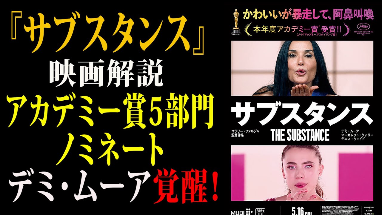 え、こぶき映画同。今日も新作映画を1本 紹介します。え、今日紹介する作品はもう 僕的にはやっと紹介できるっていうま、 この作品を死者で見たのはいつもう2月と かかな。なんでだいぶ公開まで月日が経っ たわけなんですけれども、えー、 サブスタンスという作品です。え、 サブスタンス。えっとね、年間通してね、 え、個人的なこの理害関係全くないけれど も、マジでヒットして欲しいと。こういう 作品が工業収入当てて欲しいってが何本か あるんだけど、そのうちの1本当に僕は サブスタンスを応援したいわ。え、どんな 物語かちょっと簡単に、え、あらすですね 。あらす説明。これね、あらすもまあまあ 本題早く入れって話なんだけど、なかなか むずいっていうかね。え、公式のね、基本 的には公式の今からあらすじをお話しし ますけども、それでも多くね、こうはる 部分があります。で、前半こんな感じさ、 後半どうなるかっていうお話をちょっとし たいと。あらすじですね。いわゆるこの フィットネス番組に出演していたデミ ムーア演じるエリザベスが、ま、主人公な んです。リズですね、エリザベスで彼女は 、あ、長いことそのフィットネス番組で 視聴者からも愛されて、ま、人気者だった わけなんです。ただ年を重ねて、え、ま、 50歳とこうなるとでするとね、この年齢 だとかこの容姿の、ま、衰えからこれあ、 映画的にね、用姿の衰えから プロデューサーから番組をね、交板させ られてしまうんすよ。いわゆる片きに、ま 、会うんですよね。でもね、あの エリザベスはね、諦めないの。私はまだ やれると。てか、まだ頑張りたいと。この 業界でのすんだっていうこの野心みたいな のがめちゃくちゃ強いわけな。時この エリザベスがとる広告でサブスタンスと いう再生医療の存在を知るんです。で、 この再生医療というのはこのま、若えると いううん、ものなんですよ。若返えるもの で、この若返りを求めた彼女はその禁断の 薬に手を出して、ま、しまうとすると自身 のま、この背中から若くて美しい、え、 マーガレットクエアリーエンジェルスーと いう女性がこう、ま、現れると。で、 エリザベスの、ま、いわゆるこの上位語互 感っていうのかな。だからまあ、だから まあうん。言い方難しいな。ま、分身って いう言い方をギリギリしましょうか。この 、え、数という人物は、え、要はその フィットネス番組には出演するようになる んですよ。だ、エリザベスの文身的な人間 、若い数が、あ、フィットネス番組 プロデューサーから可愛がられて、いや、 君いいねってことで、ま、フィットネス 番組の、ま、そのMCっていうか パーソナリティにこうなるんですね。で、 番組スタッフだとか視聴者から数は 受け入られて、ま、一躍スタートなると。 で、このエリザベスとスーはこの精神を こうシェアしてるんすよ。で、1週間うん の1週間経つとこのま、入れ替わるとか いうルールがま、あって、ま、共に共存し てるんだけど次第はその決まり事を破る ようになる。さあ、どうなるかっていう。 これがだから、まあ、今大体半分ぐらいの あすじでさあ、その後半はもうどうなるか 。ま、これが多分ね、もう僕の言える ギリギリだと思うし、ま、公式でも大体 この辺りのお話をしてます。でね、映画 って最近特に考えるんだけど、やっぱり ネタバレ云々って話あるじゃないですか。 全くうーん、何もないところで楽しみた いっていう人もいると思うんですけど、 多くの方はその作品が公開されてること すら知らないわけですよ。映画会的に サブスタンスは めちゃくちゃ話題です。ものすごい話題だ けどうん。そんなに映画を知らない方から するとサブスタンスという映画が公開され たの、公開終わったのなんて知らないわけ なんですよね。だからこうやって、ま、 ギリギリの部分を伝えして、僕は基本的に 公式のあらすがどこまで、え、伝えてるの かなっていうことを加した上でこういう とこでお話ししてるっていうことは前提。 この前さ、だから、ま、この作品っても アカデミー賞、第97回アカデミー賞でも ノミネートされてました。ま、デミムーア もね、え、主演女優勝でノミネートもされ ましたけれども、あの、僕だから要は ハリウトでアカデミー賞見たわけじゃない ですか。で、オープニングでこの煽りV みたいなのがあるわけですよ。思いっきり サブスタンスのネタバレしてまし た。僕ハリウッドで見ながらうわ、 ネタバレじゃんて僕も自身が言っちゃった 。ネタバレなんて観用だけど。ま、でも アメリカではサブスタンスもかなり公開さ れて立ってたから、ま、それはそれで なんていう風に思ったし、あと日本 の視聴者があのアカデミーシの オープニング見たところでサブスタンスの ネタバレとは思わなかったはず。なぜなら サブスタンスだと絶対に思わなかったと 思うから。分かります 。デミムーマが出てるとか色あるけれども 、そのわ、ネタ