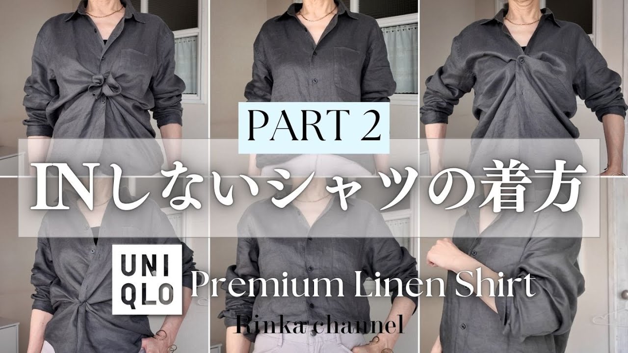 皆さん、こんにちは。スタイリストの みよしりんかです。いつもご視聴いただき どうもありがとうございます。おかげ様で 昨年の動画なんですが、イしない大人の ためのシャツアレンジ。こちらをたくさん の方に現在ご覧いただいてるみたいなん ですね。ご視聴いただいた皆さん本当に ありがとうございます。新しくユニクロの プレミアム離シャツ身長いたしました。 ですので今回も簡単ですぐできるシャツ アレンジをご紹介しておりますので、是非 最後までご覧いただけると嬉しいです。私 は普段はですね、一般個人向けの スタイリストとしてOLさんから主婦の皆 さん、そして女性管理職さんや経営者さん までファッションのアドバイスと ショッピングの同行を行っております。 それと共にビジネスの企業研修講師を行っ ております。こちらのリンカチャンネルで は40代、50代、60代の大人の女性の 皆様が毎日のファッションでもっと輝いて いただくための情報をお届けしております 。よろしければチャンネル登録とベルの 通知をオンにしていただければ幸いです。 こちらは日々のファッションですので プチプラがメインになっておりますが、 もう少し深い内容ですとかプチプラ以外の ブランドの情報なんかはメンバーシップの 方も是非チェックしていただければ幸い です。 今回購入したのはプレミアム利念シャツの メンズになります。お値段が 3990円で私はダークグレーのMサイズ を購入しました。こちらは一部店舗商品に なっております。これを購入した理由って いうのはまずですね、レディのジャスト サイズを購入してしまうとどうしても ユニクロのシャツツって真面目な感じに なっちゃってこ慣れ感が出ないのとかっこ よく切れないなと思っています。実際に セレクトさんとかおしゃれブランドさんの そういう利念シャツとかをチェックして みるとオーバーサイズでワンサイズの展開 だったりするんですね。その肩幅ですとか 身幅ですとかそういうのをチェックして ユニクロで買うにはどの辺りがいいかなと 思って考えたところをやっぱりメンズに 行きついたっていうのがございます。それ と共にこちらのプレミアムリ念シャツの色 展開、それがレディのものよりもメンズの 方が私は好みだったっていうのもござい ます。私自身この今回のこのブレーだけ じゃなくって30番のナチュラルですとか 50番のライトグリーンですとかあと ブルーなんかも綺麗だなと思いました。 ナチュラルの方も色がとっても良かったん ですが少しスケ感が強かったのでシェア感 がなくたいなと思って今回はこのダーク グレーの方を選びました。ですので、そう いった色展開もお肌の色とか期待イメージ 、そういうのに合わせてレディとか メンズっていうのも変えていただくのも いいと思います。そしてレディスを購入さ れる時はいつものユニクロのジャスト サイズではなくってサイズアップされる ことをお勧めします。アレンジする時も あんまり細みのぴったりしたものよりも 少しゆるっとした大きめの方が今回の アレンジもしやすくなるかなと思いますの で、その点ちょっと注意して選んで いただくのがいいかなと思います。今回の 撮影はアレンジをメインに見ていただく ためのものなので、このオリジナルの商品 のまま行っておりますが、私自身に着る時 はこのボタンを付け替えようかなと思って います。もちろんこのままのボタンでも チープには見えないんでよろしいかと思う んですが、私はパールのボタンに付け替え てちょっとコントラストを効かせて自分 らしく着たいなと思っています。こういっ たパールのボタン手芸屋さんにたくさん 売ってますので、是非それもやってみたい なと思われる方はチャレンジして いただければと思います 。今回のアレンジは輪ゴを使ったものが たくさん出てまいります。私のアレンジと しては分かりやすくこの一般的な色のつい たワゴムで行いますけれども、皆さんが 実際にされる時はこういうの透明なもの、 ヘアゴンで透明なものとかも販売されて おりますので、もし新しく購入される方は 透明なものの方が目立ちにくて、それで 邪魔にならないかなと思います。それでは 早速アレンジの1つ目からご紹介させて いただきます。 袖まくりの方法です。袖まくりね、なんか こう1回ね、袖まくってそれでもう1回袖 まくりするっていうようなこういう方法が 結構今ね主流になってきてますが、こ れってなかなかここが解けてきたりですと か、落ちてきたりですとか、崩れてきたり 、このやり方自体が分からないっていう方 も意外と多いかと思います。そこでおすめ がまずこちらのゴムをこのカフスのボタン こちらにこういう風に引っ掛けます 。こういう風に引っ掛けます。そして 引っ掛けたものをこちらのボタンホール こちらですね。こちらにこういう風にこう いう風に通します。そして通したものを もう1回ですね。こちらのさっきボタンを 