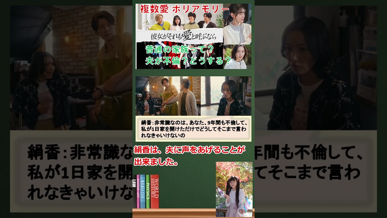 彼女がそれも愛と呼ぶなら5は妻として 母親として家庭を守ろうと必死だった。 それなのに私の家族はバラバラだ。今家族 だからこうしなきゃ。妻だからこうし なきゃ。一旦忘れてキぬはどうしたい?お 店で今たちと一緒にいるところ夫に発見さ れてしまいました。キぬかの夫?こんな ところでチラついた男たちといい年して 色気ついて気持ち悪い。恋人が3人。 あんたらみたいな非常識な連中に注かされ ておかしくなったのか。今キぬかと私の 恋人ここにいるみんなを侮辱職したこと 謝ってもらえませんか?キのか非常識なの あなた年間も不して私が1日家を開けた だけでどうしてそこまで言われなきゃいけ ないの?キぬかは夫に声をあげることが できました。帰ったらもう一度夫と話して みる。ちゃんと話したら元の生活に戻れる かもしれない。しかし夫を話し合いには 応じ今日は疲れたから忙しいからと。 キぬかは夫と話そうとしましたが夫と 向き合うことすらできませんでした。夫の 不倫相手が夫と旅行に行っていたことを 言いに来ます。キぬは全然怒りません。 あなたはそれで本当に幸せなんですかと 言われます。キぬはどうしたい?キぬかの 人生はキぬか自身のものだよ。キぬかは ハゲウトに会いに行きます。第5話の テーマは自分がどうしたいのか家族の幸せ か自分の幸せかあなたは誰に忠実に生きて いるかでした。彼女がそれも愛と呼ぶのは ポギもいいのドラマです。普通に対して 自由の大避になっています。普通は妻とし て母親として家庭を守らないといけない。 離婚したり不言したら子供が不幸になる。 子供の幸せを考えないといけない。しかし 自分がどうしたいのかです。今が3人の 恋人と暮らしていて、普通の家族でなくて も互いに尊重して楽しそうに暮らしている ところを見ます。私は家族なのにみんな バラバラだ。自分の幸せを考えて羽に会い に行くことを決めるのでした。