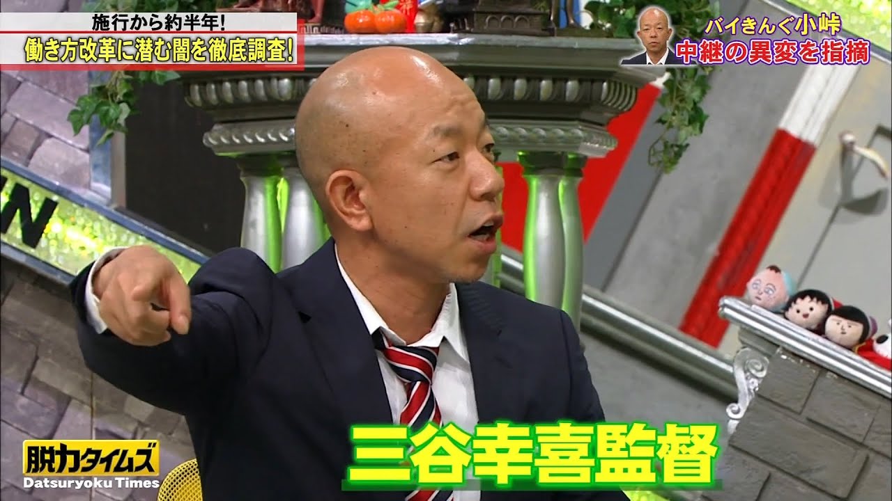 こんばんは。 こんばんは。全力脱力タイムズです。ます。 先生たちもよろしくお願いします。 よろしくお願いいたします。 さあ、それでは本日の素敵なコメンテーターをご紹介いたします。 まずはお笑い芸人バイキングの小峠さんです。 よろしくお願いします。願いします。 さん最近注目してるニュースはございますか? ああ、そうですね。やっぱそう、ま、煽り運転ですかね。やっぱ、ま、捕まってね、怖いなと思いましたけどね。 自分たちにもね、かかってきますもんね。 お願いします。お願いいたします。 そしてもう一方、女優の吉田洋さんです。 よろしくお願いします。 よろしくお願いいたします。 え吉田さん、最近気になってるニュースはございますでしょうか? あ、ニュースですか?ニュース。 ニュース。 ん? ああ、すいません。ニュース。 あ、まあ色々ありますけどね。色ありましたけどね。 ごめさん。ちょっと最近忙しくてあんまり見れてなくてあ、 すいません。 あ、そうでしたか。そうですよね。 なんかあの映画の撮影をやられてたんでしたっけ? そうですね。はい。ちょっともうなかなか時間が取れなかったんで。 映画のタイトルな何ですか? あ、タイトルは記憶にございませんっていう。 あ、記憶にござい。はい。はい。はい。 なんかね、変になんかリンクしちゃいましたね。なんかね、うまいことなりましたね、よくね。 そうですか。三谷。 あ、あ、そうです。さん監督の映画なんか裏話とかあれば [音楽] 裏話。うん。裏話し なんか大変だった瞬間とか。 そうです。ちょっと記憶にございます。 記憶にございます。 告知のねじ込み方が異常ですね。なんか、ま、じゃ、最近の打ち上げとかあるじゃないですか。映画が撮影が終わったら打ち上げて、 ま、最後はもうみた監督ともこうわっと騒いだとか。 あ、あの、三谷さんがこの映画の撮影が終わってすぐ次の撮影に入るんで、それまで休みを取ってちょっと海外、えっと、ハワイかなんかどっかに行くっていうことで、もう全然お会いしてないんですよ。 あ、もう終わったらすぐ方に行かれた。 はい。だからお茶も参加せずね。 なんかじゃ、プライベートでもいいです。あの プライベートちょっとトピックスというか うん。いや、プライベ いや、そんな別にあの、あの、突っ込んだ話をするつもりないんですけど、なんかだけでもいいんですけど、 のところですね。うん。 プライプライプライ。 いやいや、なんかありますよ、さすがに。うん。なんかあるんじゃないですかね。あ、 思い出しました。 あの、え、あの、何? 私昨日人生で初めてタピオカミルクティに飲みました。 はい。とても失礼ですよ。 ンってしてたなと思って。 はい。 [音楽] 力脱力タイムタイムで [音楽] 全力脱力タイムズは ご覧のスポンサーの提供でお送りします。はいける。 働き方改革関連法が施行され、およそ半年。長時間労働の是正や有休暇の義務化など働きやすい社会への変化が期待されていたが 残業ができないじゃないですか。 ああ、なんで生活費がカツカツです。ま、 なかなか仕事が忙しくてりづらいなという。 このように不満の声もそこで今夜は働き方改革でどんな問題が起きているのかその実態を徹底調査。実際の職場と中継を結び、働く人の生の声をお届けします。 [音楽] [音楽] うん。 さあ、吉者さん、どうでしょう?働き方改革の問題点、どういうとこかっていうのはご存知でしょうか? いや、すいません。ちょっと不勉強であまり詳しくないので、今日ここで学べていけたらいいなと思います。 ああ、じゃ、記憶にはございません。 ございませんですね。ゴリ押しがひどいですね。これね、全部それで行くんですか?今日。 さあ、え、働い方改革。これね、まだ若者もね、 理解してない方とかも多いみたいですね。だから、ま、今日ちょっとね、お集まりいただいてます。 はい。おお。 実はですね、あの、まだ、え、働い方についていつも把握できてないということで疑問や不安を抱いている、え、学生 30 名の皆さんですね。一緒に勉強していきたいと思います。よろしくお願いします。 はい。 さあ、それでは早速行きたいと思いますが、そもそも働い方改革先生 はい。世間には浸透してるんでしょうか? はい。 [音楽] あの、そうですね、これはこの働き方改革で決めました残業規制でありますとか、有給休暇の取得義務に反しますと実はこれ企業はですね、 6 ヶ月以下の懲役や30 万円以下の罰金などの、え、罰則が重されることになってます。 で、それもありましてこの働き改革に浸透しつつある感じはありますね。 なるほど。ま、その辺の、え、変わっていったのは分かるんですけど問題点ってんですよね。何が現場で起きてるのかこれを勉強したいと思います。じゃあ、ボードお願いします。 はい。はい。一旦止めます。あります。 はい。 そんなあんまり小藤さんの会社とかそういうのではあんまり そうですね。僕んところ