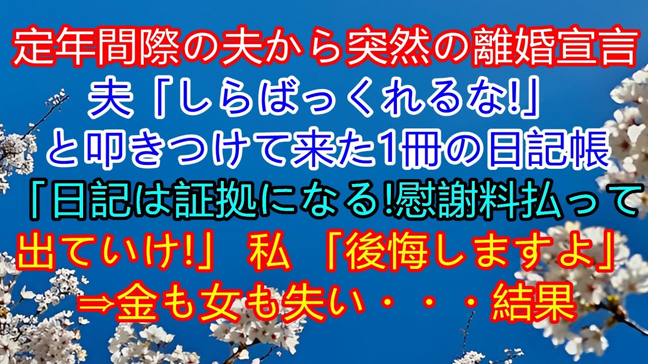 定年が近い夫からの突然の離婚宣言。夫は「ごまかすな!」と叩きつけた1冊の日記帳。「日記は証拠になる!慰謝料を払って出て行け!」私が「後悔しますよ」と言うと、金銭を貢いだ女性も失い…結果。