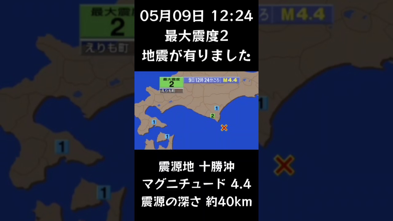 5月9日 12時24分 最大震度2の地震が有りました 震源地 十勝沖 マグニチュード4.4 震源の深さ約40km この地震による津波の心配は有りません 各地で頻繁に地震が発生して居ます 日頃の備えは大切です