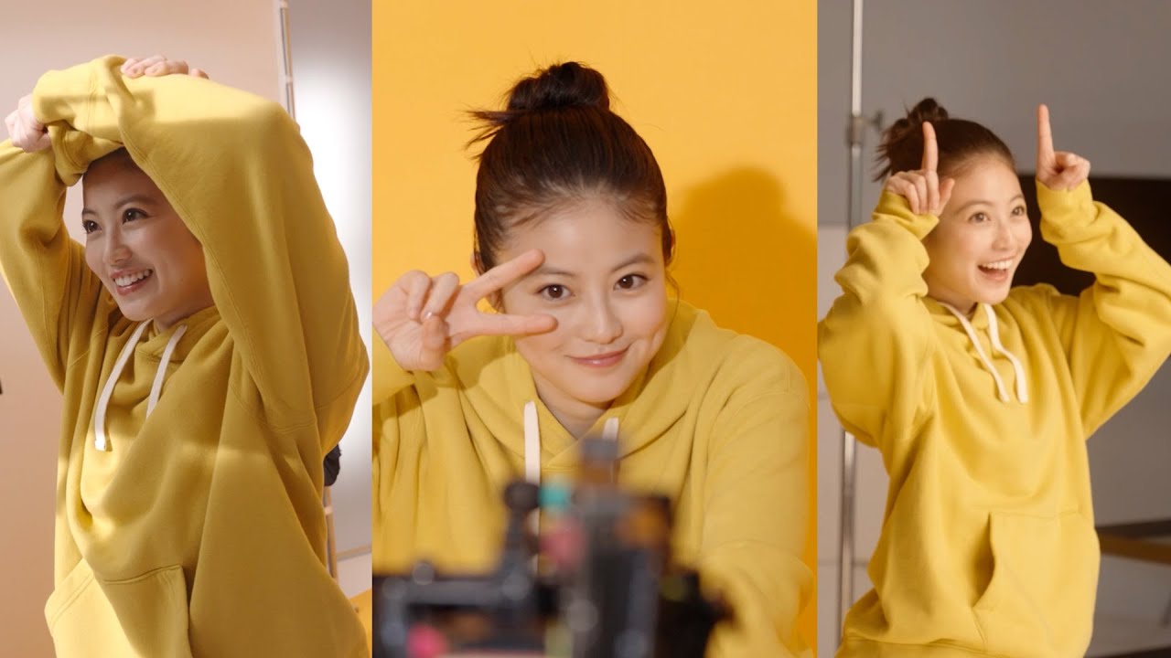 髪をアップにした今田さんは、はにかんだ表情でカメラに向かって一点を見つめていますが、よく見ると少しずつ表情が変化していき、最後はピースサインで締めくくります。
