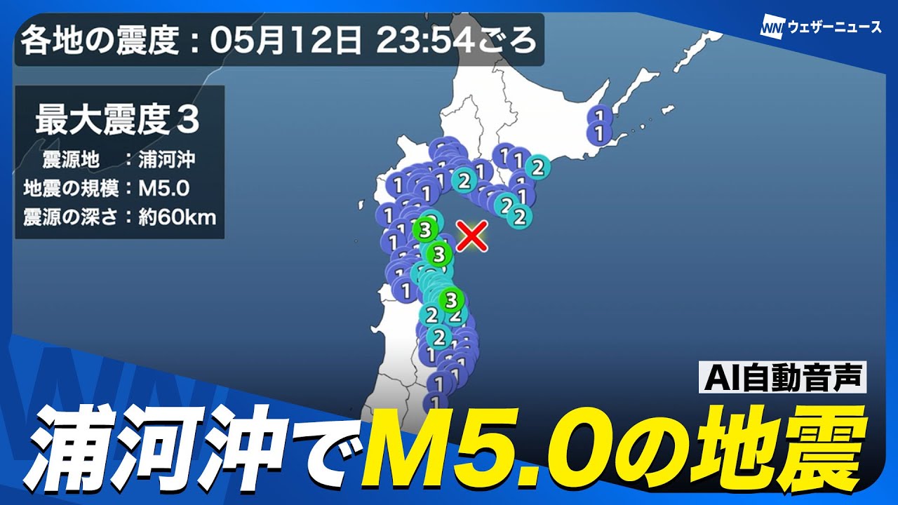 【地震情報】浦河沖でM5.0の地震 北海道と青森県で震度3 津波の心配なし/AI自動音声