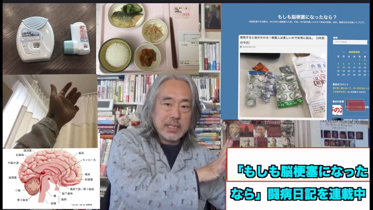 よいスタート。 え、が監督の太田です。え、相変わらず 病人してます。で、えっとね、ここ しばらくなんか、え、アメリカの話 ばっかりしてましたけれども、あの、 ちょっと、え、病気の話もまたしていこう と思います。あ、皆さん病気の話するとね 、あの、見てくれないんですけれどもね、 そういう病気の人たちに対する対応も 分かるので、え、相変わらずその、あの、 病気の話をずっとあの、続けていきたいと 思ってます。それで、えっとね、前にも 話しましたけれども、今、今というか、 えっと、え、今ですね、まさに、えっと、 このね、あの、ブログ、ブログもしも濃厚 速になったならっていうタイトルで、えっ と、ブログを、え、これね、もう本当病気 の脳梗速発症する前の前速だと思って、 最初前速から始まったんですよね。頃から ずっと書いてたんです。というのは、え、 この、え、沖縄競争局というこの ドキュメンテレが去年公開して、今は、 えっとね、えっと、Netflixじゃ ないやとこだっけ?Amazonプライム で有料配信してくれてるんですけれども、 ま、下のこの 沖縄ドキュメンタリー、沖縄線でもう1本 3本のドキュメンタリー撮ってるんで、 それ全部あのAmazonプライムで配信 してくれてるんですけれども。で、それの 3作目であるダび切れてきた。 3作目である沖縄、え、競争局の編集中に 、え、脳速を起こしたんですよ。ていうか 、ま、前速になったんです。ま、前速では なかったんですけれども、え、その時に もうすでに心臓機能が20%まで下がって いて、で、いうのもね、もうこの18年間 約20年間もう1人700でもう何度も 話してますけど、7人分の仕事をしてきた 。でも体ボロボロだってとうと壊れたのが この映画の編集中だったんですよね。だ からずっとそのための映画日記、撮影、え 、映画政作日記書いてたんで、それが途中 からあれになったんですよ。と、えっと、 え、東病人気になっていくんですよ。で、 それを今分離して別にこの何ブログ、僕 ソネットブログやってたんですけどね。で 、あの、へ、閉鎖っていうか配信になって 別のブログに移ったんですよ。で、それを 今順に映し替えてるところで、え、で、 それでこのタイトルをその沖縄競争局のに 書いてた沖縄競争局がそれで残してるん ですよ。で、そこからあのこの脳梗速の話 だけ抜き出しているんですけど、まあね、 あの忘れもしない。え、2年前の4月1日 もエプリルフールに目が見えなくなったん ですよ。のコしたんですよね。で、目が 見えなくなってっていう。だから、え、今 5月、5月ですよね。だから本当ね、 ちょうど2年と1ヶ月前なんですよね。ま 、ていうのいつかこれ映画にしようと思っ たんで記録のために忘れるんですよね。 やっぱ辛いこととか悲しいことでも書い とかなきゃとって書いて書いたら読めて ないですよ。だけどそれをえ、今順に移し ていてで今ね、えっと、4月分から4月分 じゃ3月、あ、もうちょっと前から始めた んだ、あの、で、それ読んでて、いや、で もやっぱりね、忘れるんですよね。ま、 忘れないとね、あんまり辛い経験までも 覚えてたらってのあるんだけれども、読ん でたら結構ああった方もっていうのね、 ちょっとそういうのもあの、つまり、えっ と、ま、今だいぶ良くはなってきてるんで 、そうするとやっぱりその悪かった時の 気持ち分からないので、え、でも本当に こう濃足で苦しんでる人とか障害抱えて しまった人がどうなのかっていうのをする ために当時のこう書いたものをご紹介する のが1番伝あると思うんですよね。で、 えっと、そん中でね、えっと、例えば、あ 、これ、これ、これ面白いな。あの、えっ と、ま、2年前の、ま、今日、今日とか 昨日ですよね。 え、読めるかな?ちょっとまたんだけど。 え、5月12日、おはようございます。 先日病院で仕事をしてもいいよと許可を もらった。あ、そうか。やっぱ1ヶ月以上 かかってんだな。もう先生が軽くね、あ、 仕事再開していいですよとか言って言われ たけどとても再会できないだ。字も読め ないし、え、書けないしでもう頭もうボげ てて、 えっとな何だっけってだから今何考えてた か忘れちゃうんですよも。ま、もう ちょっと出ますね。 えと、え、映画監督業を再開と言っても、 え、体力が小学生レベル。さらに、えー、 脳梗速で、え、脳全体が低下 。物忘れがひどい。ファインディング ドリー状態なのだ。ファインディングド リーって言ってます。の、え、魚、魚の おばさんの 話し魚のおばさんの話すぐ忘れちゃうのっ てなぜかこれ日本語版で見たんでね、あの 、え、映画館であのなんかあの日本語版 しかやってなかったんですよ。なんか ピックさんの映画って家族向けなのかで、 え、すぐ忘れちゃうのっていうあの怖い目 にあってもすぐ忘れてしまう。こ魚さんの 話でで、ファンディングドリ ファインディングにもま、続編ですよね。 もう本当そのね、ファンディングドリー