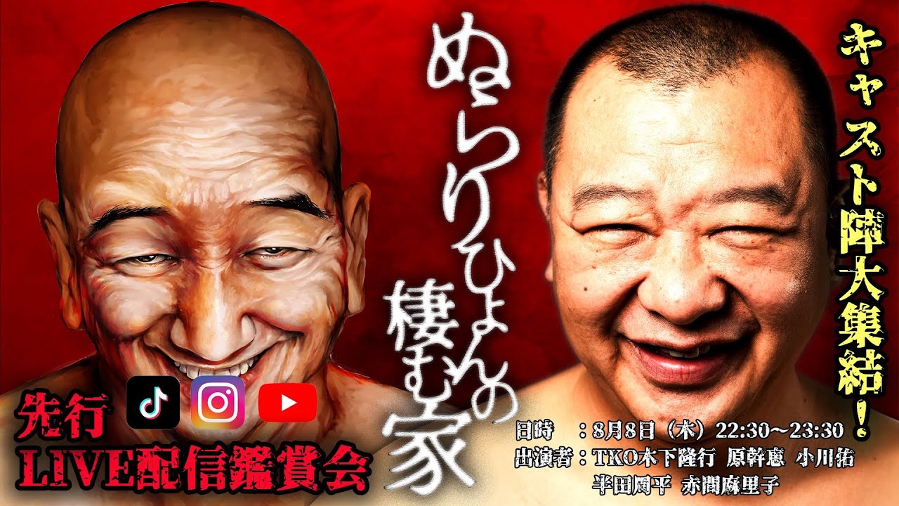 スワイプドラマプレゼンツぬりヒョの住家 キャスト鑑賞 会さあ皆さんこんばんはTKO木です ショートドラマぬらりヒョの住む家配信 記念スペシャルキャスト鑑賞会のライブ 配信にようこそ今回はスワイプドラマ第1 弾オリジナル作品ぬらりヒョンの住む家を 皆さんと一緒に見ながらですね私たち出演 者たちが見所や撮影の裏を話していこうと いう企画となっており ますそしてこの配信限定で1話から5話 までですね先に見せちゃいますえ見てる方 はすごくラッキーということになりますね 視聴者の皆さんも是非参加してコメントや リアクションどんどん送ってください そしてXでですねえハッシュタグスワドラ ねスワスワイプドラマスワドラとつけて ポストしてくれればそちらも読ませて いただきますので是非お願いします それでは早速出演者の皆さんを紹介して いきましょうさあまずは私え沼尻を演じ ましたTKOの木ですよろしくお願いし ますそして続きましてお願いしますはい 主人公田役を演じました小川と申します よろしくお願いします よろしくお願いし ますの 父親の よろしくお願いし ますお願いしますえ和弘の母親小山田金子 役の原見ですよろしくお願いしますはい よろしくお願いしますえ沼尻の妻証拠役の 赤間まり子ですよろしくお願いします よろしくお願いしますさあこ今日はこの5 人で楽しみたいと思います今日よろしくお 願いしますよろしくお願いし [音楽] ますさあ始まりましたけどもまず皆さんと ですねお話する前に本作品が配信される アプリスワイプドラマについて簡単に説明 させていただきますスワイプドラマ略です スワドラはですねえ様々なジャンルの ショートドラマが楽しめる新しいアプリと そしてヌラリヒョンのスム家は全28は ありますアプリがリリースされたら ダウンロードして最後まで見てください そして明日からスワイプドラマえSNSの 公式アカウントからですね無料公開されて いきますので是非フォローして皆さん見て くださいそして好評であ えの次作がうんあるかもしれませんという ことなんで本当によろしくお願いしますお 願いします待ってます願さあえこの後本編 をですね皆さんに見ていただこうと思い ますけどもその前にちょっと皆さんと少し だけお話ししていきたいと思いますけども いよいよぬりひの住家公開していきます さあ赤浜さんはい今のお気持ちいかが でしょうか今のお 気持ち松田みたい 今の気持ちをですねいやあの怒涛の撮影の 日々思い出しながらですねちょっと ドキドキしてますねこれね見てもらったら 分かりますけどすごいですから今のこの 時代 にこんな映像ええのっいう本もう前は前は キキなキキなキキなシーンがあるので特に 赤間さんすごいシーンですよまだ言えませ んけどこれ5話以降とんでもないことなっ てるからいい子は見ないでねっていういい 子は見ないでねちょっといろんなシーン ありますけどもはい楽しみですさあオ君 はいいかがでしょうえめちゃくちゃ緊張し てますもう緊張してる自分のお芝居が世に 出るっていうのが僕あんまり経験ないので あそうかそうなんですただもう本当に 面白いことだけは言えるって本当自信持っ て言えるのでそうねこのドラマがね本当 です本当に本当に自信持って言えるので なので少しでも多くの方に見ていただき たいです本当にほんまにちょっと皆さんに ちょっとこう1人10人ずつあの宣伝し てってください本当願110人必ずお願い します願しますさあ半田さんいかが でしょうはいえっとそうですねうんま取っ て間がないような気もするんですけれども はいはいこうみんなで作り上げた世界うん がえ公開になって全く知らない方たちええ のの目にどう映ってどういう反応が返って くるのかがすごく楽しみでもありはい怖く もありそうドキドキワクワクですねいや この僕とハダさんのやり取りをこうほんま にこうリアルじゃないからね本当もちろん 当たり前ですけどいやあれはリアルだった と思う何がややめてよ休憩中やってました もねとんでもない中やってる かがいやいやこれちょっとどう映のか僕も ですけども原さんいかがでしょうはいいや もついにできたのかと今日を楽しみにして たのでちょっとまだ私も見てないんであ そうなんそうなんですまだ皆さんと同じ 気持ちで今日1話2話3話5話5話まで 楽しんでみたいなと思うんですけどでもね あのちょっと作品からは伝わらないぐらい このわあいあいさと言いますか確かに確か になんかねあの多分皆さん見たらびりする と思いますこのギャップがこことの ギャップが本当にあるのでちょっとね目を 見開いてそうね見て欲しいよね怖はい怖い 感じで見ていただけたらいいなと思います ただね僕に関して言うと半田さんちょっと 僕に距離あったと思いますよこの役的に そうされてたような気はしますそうかも しれないうんなんかあんまりこうなんか 弱気やいやいしたらあかんま後で分かると 思うんですけどそれ関係性な
