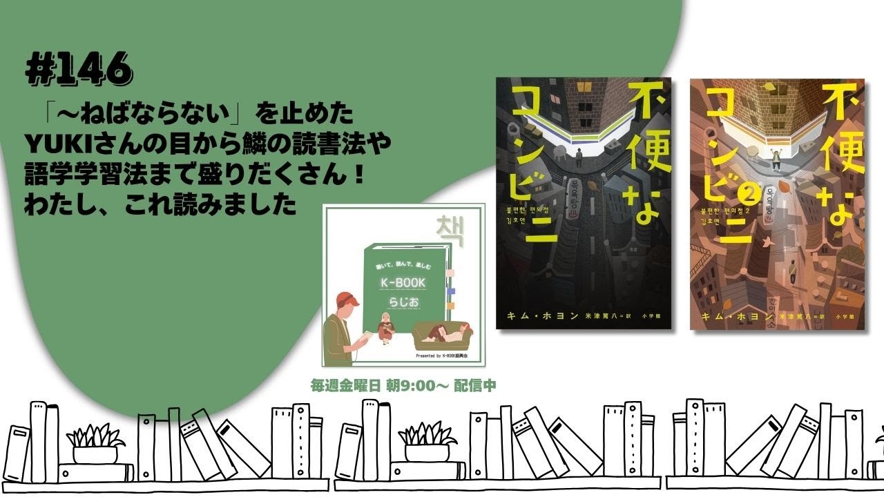 皆さんにおはせよ。韓国の本が好きな あなた、話題の本のゲストトークや注目の 新刊情報をお届けするインターネット ラジオ、聞いて読んで楽しむKブook ラジオです。 担当するのは警公会の佐々木静と 豊田し子です。 今週の私これ読みましたはゲストを迎えしてお届けします。 Xのアカウント名、え、ゆきさん、幸、 えっと、ひがゆ、そして、えっと、 アルファベット、そして年間100冊で さらには国旗で日本、韓国英語 中国日本は入ってないかの、えを勉強中と ありますゆきさんにお越しいただきました 。本日はよろしくお願いします。よろしく お願いします。はい、そうなんです。年間 100冊っていう言葉にも引かれましたし 、さらにはね、韓国語勉強してる方は いっぱいもちろん存じ上げてるんですけど 、さらには本当に英語もあの中国語も勉強 されててっていうところにもすごく興味を 惹かれてあの本日お招きしました。で、な んだろう。今は本当に読書法は始めね、 いろんな方があの本読みたいけど読めない とかね、あのみんなどうしてるんだろうと 思ってる人が私も含めて多いと思いますし 、語学学習どうされてるのかな、どう 楽しんでなければこれは難しいだろうなと 思ったのでその辺をお伺いしようと思って ます。 で、そう思う思ってたタイミングで私が検務するっこりのイベントにね、今大阪でいらっしゃいますもんね。 はい。で、大阪からね、お越しくださったんそれでこれは運命だと思って今回お願いしたいんですけれども、お越しいただいたのがキヨさんの不便なコンビニ 2の観光イベントでした。 あの時会場参加されてみていかがでしたか? いや、もう最初に確かでこのイベントが開催されるっていうのを 確かせこれさんより前に小学館の翻訳本は アカウントか何かで発見してねえ、 もうこれはもう売り切れるぞと思って、 もうすぐに申しこなまらなければと思って、もう本当に手段とかも考えずに ね もうすぐ押してましたね。行きたすぎて。 あ、本当にすごい。いや、 なのでで結局いらっしゃった時にそっか 大阪からだったんだよなって改めて思って すごいなと思っなんか 場所を考えてなかったというか、あの、もし韓国で同じようなイベントがあっても 行きたいところを日本に来てくれる。 ええ、そこていうの聞いて、 ええ、もうなんか これまでのその韓国語繋がりのお勉強してる友達とかにもこんなんあるよ、こんなんあるよってめっちゃうん。すごい 言った宣伝してくれさんですね。 はい。そん時にあの、あの、私がすごく元々その、ま、本よりも前にもう不便なコンビニが好きすぎて うん。うん。 いろんな人にお勧めしてたので、 あの、 ゆきちゃんの食べのイベントだねって言われたくらいだったので。 へえ。 本当にもうあんなに何も考えずにもう 行きたいって思いました。 けどそんな熱い思いはあのひーちゃんとほよんさんにお伝えできたんですか? いや、もうまずはあの席につく段階で あの あの行く前からあの1 番前に座ってやるみたいな気持ちではいたんですけどなとちょうどちょっとじゃ遅れてしまって私が到着 なんですけどギリギリなんとか吸われたので あのまずは暑い視線かなと思ってましたね。はい。 いや、本当にあの時にお越しいただいた時にそのもう好きすぎてっていうか大好きなんですってオーラはすごく出てたのはなんかあの私も拝見していてあの思いましたけど実はねあのチェッコりのイベントにはその前にもなんかいらしてくださったことがあったとか そう とかがたくさんあったので、あの、その時やっぱりオンラインね。 うん。あ、ありがとうございますけど。うん。 その時は質問送ったりとかしてました。 ありがとうございます。そうやってね、色々 K ブックにも楽しんでいただいてるゆさんですが、では改めてリスナーの皆さんに自己紹介をお願いします。 はい。えっと、現在韓国語を勉強している幸と申します。 えっと、韓国語を勉強し始めたのは、えっと、 2020年の5 月からなので、ま、大体5 年経ったぐらいかなと思います。うん。はい。よろしくお願いします。 はい、よろしくお願いします。でね、先ほどアカウント名のところにもね、あの、年間っていうキーワードがこうついてらっしゃるんですけれども、あの、本当にたくさんの本を読んでらっしゃる。目標にされてるってことですかね。 年間100冊を読もう。 そうですね。なんかこう基本的に自分がこう数字とかあの 例えば試験だと記述とかがあると うん。なんかやる気が出るタイプなので うん。 それをまず目標にしてクリアできるかいうところから最初は始まった感じでしたね。はい。 うん。 で、ちなみにね、あの、実は前回も、あの、私これ読みましたには出演してくださったさやさんもたくさん読んでらっしゃったんですけど、 ちなみにですけど、ゆきさんは年間でどれ、あ、ね、月刊 月にするとどれぐらい読んでるん? なんかちょっとその忙しかった