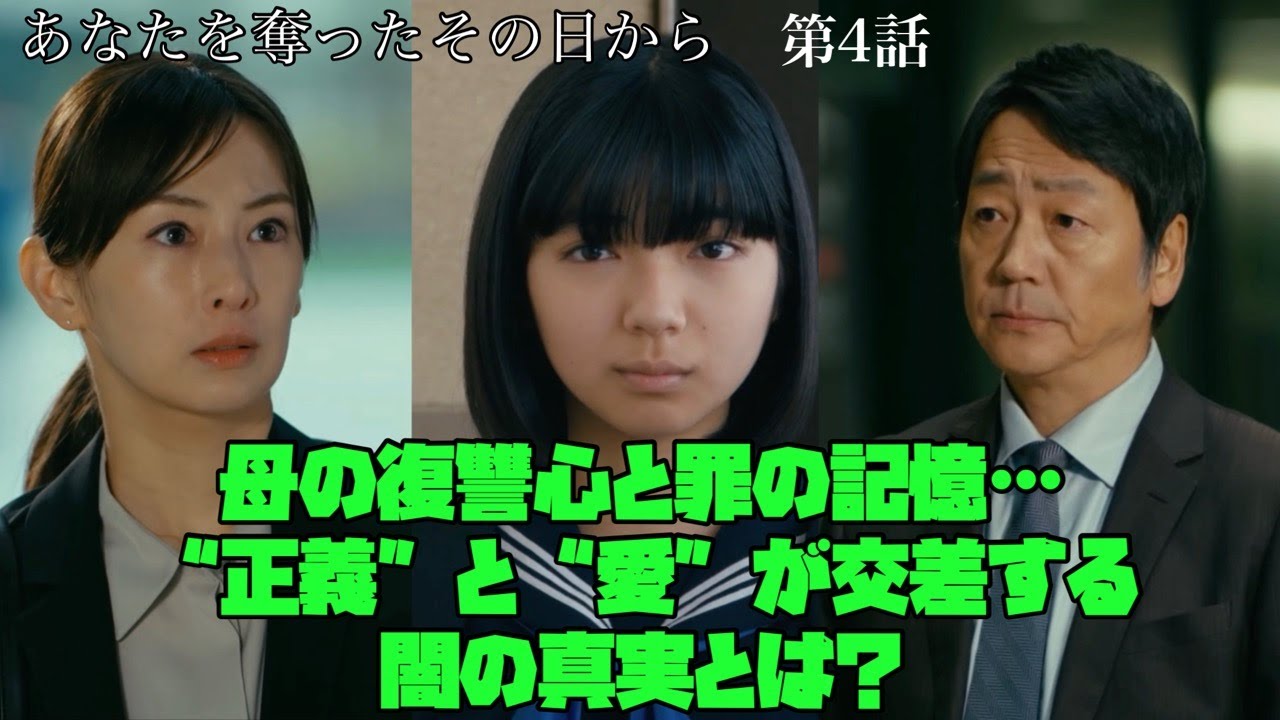 [音楽] あなたを奪ったその日から第4は母である こと、罪を抱えること、そしてその罪と どう向き合いながら生きるのか。第4話で 描かれたのはただの家庭の風景ではあり ません。日常という名の仮面の裏に潜む嘘 と怒り、そして後悔と許し 。あなたを奪ったその日から第4話を 振り返っていきましょう。鉄道設計技士に なりたい。夢を語る耳の目はまっすぐで 曇りがありません。しかしその隣にいる広 は日々の生活に追われ、現実の中で懸命に 生きる罪を抱えた母です。耳が言った電車 のチャージをさせていただきたくという 言葉に何気ない親子の会話のようでいて 未来を前に進めたいこと過去に縛られて いる母のくっきりとした大避が 浮かび上がっているのではないかと思い ます。広みの中には夢を描くことすらでき なかった自分への悔しさがあったのかも しれません。そしてこの場面は彼女がなぜ 復讐にこだわるのかを読み解く手がかりと なるような気がします。管理栄養師であり ながら健康に悪い相打を毎日の黒蜜光 きなこ相田は広みの心の歪みを象徴して いるのではないかと思います 。子供たちには内緒という言葉。それは罪 を抱えた自分の行動をごまかすための日常 的な嘘なのではないでしょうか。一方、 久村もまた就職先を失った過去を抱えた 人物です。2人の間に生まれる共犯的な 空気、それは社会のルールから外れて しまった者たちの静かな連帯なのではない かと思います。ここでの何気ない会話の1 つ1つが後半の怒りや復讐の塔につがって いきます。SNSでセク原加害者にされた という小村の過去。その裏にはある家庭の 異常性があったことが匂わされます。 そして驚くことに気づかされます。その 家庭こそが勇気朝日の家だったのです。 セ原を出っち上げられ人生を壊された村。 一方でその家族である勇気朝日は濃と社会 で出世している。人殺しが出世するなんて この言葉がこの物語を根底から揺さぶり ます。このシーンは視聴者の正義感を 書き乱み出す重要なポイントとなっている のではないかと思います。久村と広みの 許せない相手が勇気朝日という点で共通し ているというところに注目したいと思い ます。企業の乗務として迎えられる勇気 朝日だが、その栄光の裏には10年前の死 と失踪があります。彼は表部隊では エリートとして称えられ、裏ではかつての 部下たちと共に罪の過去を封じ込めている のだと思います 。社会的成功と道徳的破壊が同時に描かれ ていきます。華やかな場面の中に感じる 違和感を拭えません 。罪がさかれず、隠されたまま栄光だけが 上塗りされていく。この皮肉が広みの 復讐心をさらに書き立てていくんだと思い ます。黙って面接へ向かう広み。その理由 は家庭と娘、そして正義の間で揺れる彼女 の最後の希望でした。初めての喧嘩は娘の 成長と同時に親子の関係性が壊れていく ことへの恐怖でもありました。しかしその 対立の中にこそ広みの人間らしさ、そして 母としての未熟さと愛が深く描かれている と思います。何かを手放しても何かを守る 。それが広みの人生そのものです。圧迫 面接。それは広みにとって過去の生産だっ たのではないでしょうか。質問の1つ1つ は彼女のキャリアの否定、母としての存在 の否定けれど彼女は黙りませんでした。 後悔しない方を選ぶ 。子供を奪われた母として今何を選び、 どう生きるか。その答えがこの面接の一言 一言に込められているのではないかと思い ます。スイッチバックは全然楽しくないん です。広みのこの言葉は母としての実感と 怒りを交えたまっすぐな批判でした。 ナチュラル、ヘルシー、サスティナブル 企業が掲げる理想は立派ですが、子育ての 中の家庭にとっては時短、美味しさ、色彩 色り、楽しさこそが本当に求める価値です 。広みのプレゼンは商品開発や マーケティングの奥深くに突き刺さる本音 でした。そこに嘘はありませんでした。 ただの母としての実感から出た言葉だった んだと思います。 喧嘩をしたまま面接に向かったひ論。残さ れた耳はお弁当を思い出しコンビニで買え なくなってしまいました。ここにあるのは 後悔と感謝が静かに交差する瞬間だと思い ます。卒業文集にはお母さんいつも ありがとうと書かれていました。たった 一言でもその一言は母への不満やすれ違い を一気に溶かしてしまう。涙が出るほど 温かい言葉だったのではないでしょうか。 あと半年だけ頼めないか。1人は亡くなっ たはずの娘の誕生日を迎えるその日まで 広みに託された復讐の延長戦だと思います 。広みはお客様相談室という配属になり ました。しかし裏では勇気朝日への報復へ 動き出すんだと思います。彼女の語った 言葉はこうでした。人は私を道に外れた女 と言うだろう。 な道を踏み外してしまった悪女だと。だ けど私は道を踏み外したんじゃない 。私は自分からこの外れた道を選んだ。 ただ母親であるため にラストで登場する耳 の娘ですという一言。それ