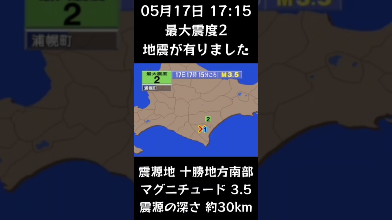 5月17日 17時15分 最大震度2の地震が有りました 震源地 十勝地方南部 マグニチュード 3.5 震源の深さ 約30km この地震による津波の心配は有りません 各地で頻繁に地震が発生して居ます 日頃の備えは大切です