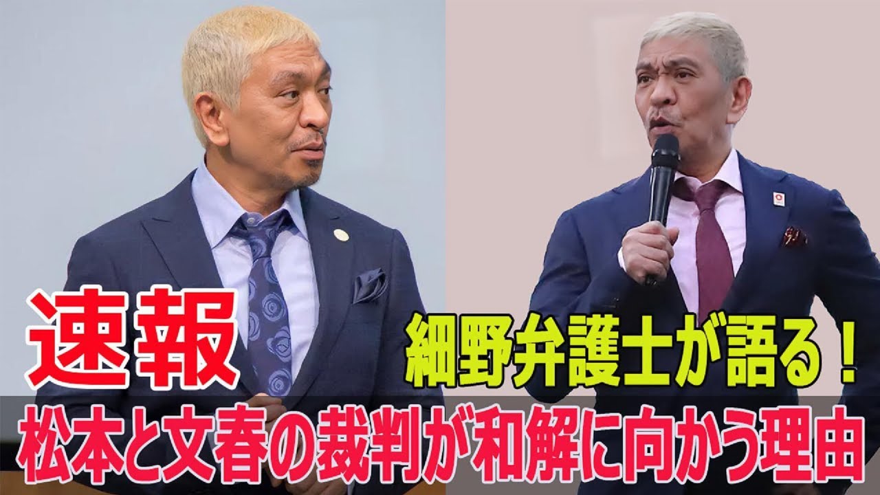ダウンタウンの松本仁60が自身の女性 問題を報じた週刊文春の発行元である文芸 春10などを相手取り名誉既存で5億 5000万円の損害賠償を求めた裁判この 裁判では8月14日に予定されていた第2 回弁論準備手続きが延期となり物議を醸し ていましたがここに来て事態が大きく動く 可能性が浮上しています弁論準備手続きが 延期された理由はされていませんが文春側 の弁護士である北村洋一氏は裁判所の決定 ですとして東京地裁からの提案であること を説明しましたまた北村弁護士は証拠は 20個ほど提出したと述べさらに記事内で 松本に対し男女の関係を共用されたと主張 する栄子さんらが出定する可能性について もそれはあるでしょうねとコメントこの 発言もまた話題を呼びました文春側がが 20個もの証拠を提出しa子さんが出定 する可能性がある一方で松本さんと文春側 が和解に向けて動いているとの噂もあり ます早ければ9月初旬にも結論が出るので はないかと囁かれていますと語る関係者も います特に弁護士細の厚市59は8月28 日に自身のYouTubeチャンネルで 松本の裁判に言及し8月中に和解が成立 する可能性が高いとの見解を示しました細 の弁護士は和解が成立すれば松本さんの 復帰のタイミングが小点となります特にM 1グランプリへの出演が注目されています とも述べており松本の復帰に向けた動きが 進んでいるとの見方が広がっています松本 は3月25日にX9Twitterを更新 し1日も早くお笑いがしたいと綴っており 早期復帰への強い思いを示しています民法 危局関係者もスポンサーとの調整も進んで おり和解が成立すればM1への出演も現実 身を帯びてくるでしょうと語っています 松本は1月8日文春との裁判に専念する ために芸能活動を休止し事実無根なので 戦いますと宣言一方文春側も7月11日に 松本側の弁護士による英子さんへの出定 妨害疑惑や定を雇って日常生活を探ってい たと報じ両者の間で法廷外の乱闘騒動が 巻き起こるなど激しい対立が続いていまし たただここに来て和解の可能性が浮上した 背景には松本の早期復帰への思いが大きく 影響していると見られています裁判は長期 化すると疲弊するものであり文春側も記事 には自信を持っているものの負担を考慮し て和解の可能性が高まっているようです 長期家が予想されていた松本と文春の裁判 ですがここに来て一気に和解の可能性が 高まっています活動休止から230日以上 が経過した今松本仁の復帰同校に注目が 集まりますご聴者ありがとうございました 今後も興味深いニュースや話題についてお 伝えしていきますので是非東チャンネルを ご読くださいまたご意見やご感想もお待ち しておりますので是非コメント欄にお 書き込みください引き続きよろしくお願い いたします