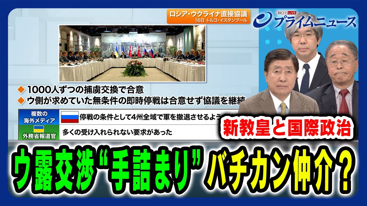 こんばんは。5月19 日月曜日のプライムニュースです。 今夜のテーマはこちら。ウクライナロシア手打にバチカも国際情勢を変える鍵とはです。ゲストをご紹介します。外交ジャーナリストで作家の手島一さんです。よろしくお願いいたします。 願します。 そしてフランシスコ教皇の時代、およそ2 年にわってバチカ講師を務められた徳しげさんです。よろしくお願いいたします。 よろしくお願いします。 そして国際政治外交がご専門の慶王大学教授細や優一さんです。よろしくお願いいたします。 昨日新しいローマ教皇に選出されたレオ 14 世の就任を祝うみがバチカンで行われました。 指点にはウクライナのゼレンスキー大統領 を始め、およそ150の国と地域国際機関 の外交団が参加。教皇の出身地アメリカ からバンス副大統領とルビオ国務長官。 日本からは麻生元総理。ロシアからは リビモア文化賞が出席しました。 ゼレンスキー大統領は前の教皇の葬儀も 今回の就任さにも参加し、その後レオ14 世と会談も行っています。 は点でウクライナは高成で永続的な和平交渉を待ち望んでいるということも発言していましたけれども島さんこのゼレンスキー大統領と教皇がバチカンで怪談したこのなんて言いますか?意義というのはどうご覧になっていますか? の一連のところ全教皇の葬儀それに続く就任につきこれもセットで考えるべきだという風に思いますよね。 その隠れた主役はトランプ大統領いうことになるんですけれども、最も重要なところはやっぱり新たに今もアメリカ出身い風な指摘がありましたけれども、レオ 14 世っていうのは南米で宗教活動に入った人なんですけれども、アメリカ出身ということは取り物さずアメリカのことをよく知る。特にアメリカのグラスーツを良く知っている。 それを通じてですね、トランプ大統領と いう人がですね、どういう人なのか、どう いう、え、リーダーなのか、そして草の アメリカ人から特にプアファイトのような 人たちからですね、指示されるトランプ 大統領の内在論理はどうなのかということ を最もよく知ってる。 で、少し踏み込んで申し上げると、え、あの、コンクラベは毎回ですね、こうかなり荒れる場合もあるんですけども、今回は比較的すんなりと決まったということで言うと、暗黙のバチカン全体の意思としてですね、そういうトランプ大統領というですね、ま、言ってみれば、え、トリックスターのような人がいるという中でバチカン全体はトランプさんを、ま、比較的よく知るそうし 教を選んだという風に申し上げていいん じゃないでしょうか。で、その末に、え、 始まっていたそして葬儀とそして一連の 就任式ということですから、これがこんな にやっぱり注目をされてるのは取りも直さ ず、今お話があったように、え、この一連 の新しい体制は今まだ続いてる悲惨な、え 、ウクライナロシア戦争に収支を打てるの かどうかいうことと密接に関わっている。 そういったに今回こういう番組を設定されたんだという風に思うんですけど、まさにその狙いはですね、国をいているという風に思います。 まさにその点についてじっくりとお話を伺っていきたいと思っているんですけれども、徳さんはこのレオ 14 世という新しい教皇の誕生をですね、どうご覧になってますか? はい。あの、今、あの、先生のおっしゃった、あ、全く同でね、あの、本質的に今何が起きてるか、今現在進行系ですよね。 最新のニュースではレオ14 生がカの場所を提供したいと何時間か前に言ってます。 はい。 従がって今あのトランプの人はもう世界で中心です。今意味においてね。 それからウクライナ問題に限れば ゼレンスキーとあとプーチンとこの3者 ですけれどもその3者にあのバチカ両14 世場所を貸すとここまで踏み込んだ人い ません。あの、あの葬儀の時のね、あの、 大きく変わりましたけど、あの、プーチン とゼレンスキー会談もあれは別にね、あの 、し、ま、まだ就任してなかったです けれども、なんかね、表だって制限した わけではないですよね。 だからそう見てくると今バチカンはまさにね、ここま数日戦になるかもっと長くなるかバチカンが世界政治のね、世界情勢を見る場合の、ま、中心になりつつあると そのように私は見ております。 うん。今のお2人のお話もありました。 その就任式というところに話を戻すとですね、そのゼレンスキー大統領 2 月に首脳会談で喧嘩別れをしたアメリカのバンス副大統領と今回のこの就任式点で握手を交わしているわけですね。この辺り細谷也にはどうましたか? あの非常に象徴的だったと思いますね。ワンス副大統領との会談。 元々あの、元々2月のあのホワイトでの 騒動というのは最初あのトランプ大統領と の間はゼネスキー大統領有効的な会話だっ たんですよね。絶対40分ぐらい。ところ があ途中からあのバンス副大統領が入って から元々バンス副大統領はま、大統領選挙 の前からま、アメリカのあ