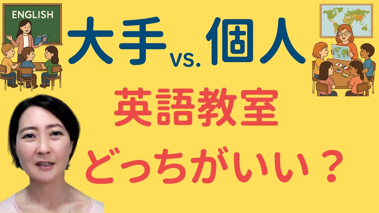 皆さん、こんにちは。後悔しない小学生 英語中目黒スマイル英語教室の田中です。 え、今日は、え、大手の英語教室と個人 教室の違い比べてみたということで、え、 今お子様の英語教室どこにしようかなと 悩んでいらっしゃる保護者の皆様に、え、 ヒントをお伝えできればと思っています。 え、大手教室と個人教室という括りだけで はなく、え、今世の中にはお子さんの英語 教室って本当にたくさんありますよね。え 、もうそれこそ星の数ほどあって、多分ご 自宅から通える範囲にある教室、それから 、え、もしかして最近ではオンラインだけ で学ぶような教室もありますので、え、 本当に選択肢がたくさんあって、どこが いいのか迷われている方多いと思います。 え、私自身も、え、自分の子供の英語教室 を探したことがあって、え、結局私はその 時納得いく教室が見つからなかったので、 え、自分で子供を教える、そして英語教室 も自分で立ち上げるということになったん ですけれども、伺ったいくつかの教室、 全くタイプも違って、え、もし選ぶんと なると、え、ど、どうなるのかなとすごく 、え、迷った経験がありますので、え、 そういったお子さんの英語教室に迷って しまわれる方のお気持ちは大変よくわかり ます。で、今回は、え、大手教室と個人 教室という風に分けて、え、それぞれの 特徴やメリット、デメリットをお伝えして いくんですけども、まず、え、今回の動画 で大手教室と、え、いうのは、え、全国 展開、または地域展開の教室や、え、個人 の先生が教えているんだけれども、え、元 の会社は同じといったような フランチャイズの教室のことと定義させて いただきます。で、一方で個人教室という のは1人の先生もしくは、え、証人の先生 が、え、そこだけでまた、ま、校舎いくつ かあるかもしれませんけども、基本的には そこだけで、え、運営しているような小 規模な教室を指すと定義させていただき ます。え、実際にはこの大手教室、個人 教室というだけでは、え、その括りだけで は説明できないようなほど、え、教室は たくさんあるんですけども、今日は分かり やすくその2つに絞って、え、それぞれの メリットとデメリットをお伝えしていき ます。え、まず、え、大手教室の特徴なん ですけれども、え、大手教室といえば、え 、皆さん多分お子さんの英語教室といえば 、あの、会社とか、あの、ブランドとか、 え、ご存知のものがあると思うんです けれども、え、そういったブランドの安心 感があると思います。で、大体そういった 教室には、え、教材がずらっと意識揃って いて、え、コースでここからここまで きちんと学べるといった安心感もあると 思います。それから、え、大手教室には 大体、え、複数の先生が在籍しているので 、お子さんが例えば1人の先生とちょっと 合わないと感じられた時も、ま、ちょっと 教室によるかもしれませんけど、もしか すると、え、別の先生の別のクラスに 移れるといったことがあるかもしれません 。え、また、え、地域展開、全国展開され ているようなフランチャイズの教室では、 え、お引っ越しをした後も、え、別の教室 に通って、え、同じカリキュラムで学びを 続けられるというのもメリットだと思い ます。え、で、メリットとしては、え、 こちらは、え、教室や会社の方針によるか もしれないんですけども、私の聞いている ところによれば、え、カリキュラムが かなり決まっているので、え、生徒さん 1人1人に合わせた別対応はちょっと 難しいところが多い。オプションの口座を 選んだりすると可能かもしれないんです けれども、え、そういった個別対応が 難しいところが多いと聞いています。それ からこれも、え、大手教室の先生方、え、 複数名から聞いた話なんですけれども、え 、どのようなお子さんも、え、来られる ような教室でカリキュラムが作られている ために、え、内容がや広く浅くなりがちと いうことも聞いています。こちらも デメリットかなと思います。一方で、え、 個人の英語教室の特徴なんですけれども、 ま、個人で英語教室を始めようというから には、え、先生がこだわりを持って レッスンをしているような、え、教室が 多いというのが、え、特徴で、え、 メリットとなりるかと思います。また、え 、それぞれのお子さんに合わせた、え、 柔軟な対応がしたくて、え、以前は大手 教室で働いていたけれども、やっぱり個人 教室にしましたという先生も、え、多い ように、え、私の周りには、え、そういっ た先生も多いように感じていますので、お 子さん1人1人に合わせた柔軟な対応は 個人教室の方が得意かなと思います。た、 え、先生によるかもしれませんけれども、 え、私が感じているところでは、え、大手 教室の決まったカリキュラムよりは、え、 融が効くように、え、レッスンを行えるの で、内容が深かったり面白かったり、え、 独自性がある、え、そうし