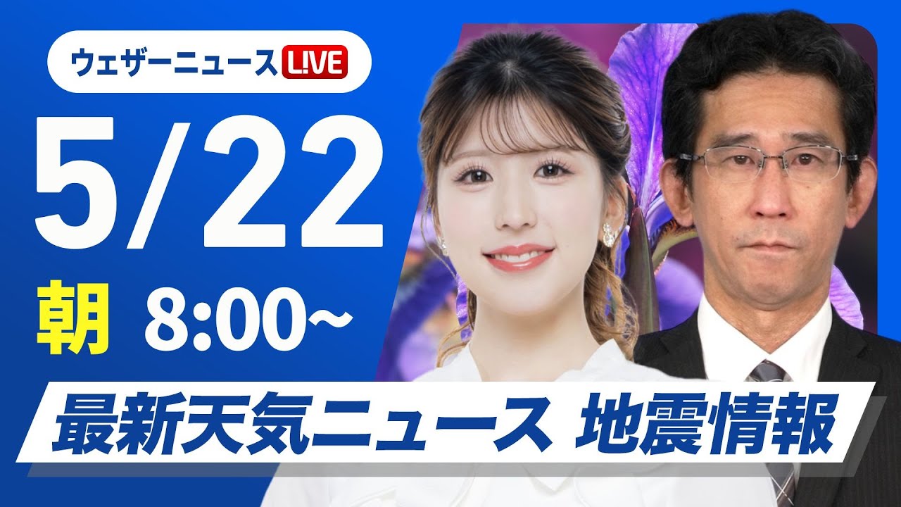 【ライブ】最新天気ニュース・地震情報 2025年5月22日(木)/関東以西の雨は朝までがメイン 東北や北陸は昼間も雨が降りやすい〈ウェザーニュースLiVEサンシャイン・小林李衣奈/山口剛央〉