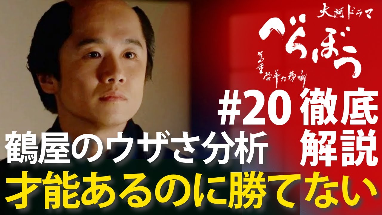 はい、皆さんこんにちは。木下と申します 。本日はベラボ第20話の徹底解説をお 届けいたします。こちらドラマ解説 チャンネルでございますので、今回の20 話を私はこういう風に解釈したよ楽しんで ということを皆様にお届けしてまいります 。いい意味で歴史系YouTuberの皆 様の動画と共存する動画となっております ので是非最後までご視聴いただければと 思います。今回全部でここのお話をさせて いただければと思っておりまして、まずは ですね、ま、交所動というか江同支中 パートの話の方から進めさせていただけれ ばと思うんですけれども、まず、え、汚い 真似は仕開始にということでございまして 、今回のですね、ま、ツタ中パートに関し ては、ま、太田南方がですね、非常に印象 的ではあったんですけれども、今までの キャラクターの部分の話でいくとですね、 ややはり日本陣営特にま、鶴及び西村屋が 今回は、ま、古テパにやられたと言っても 過言ではない会でございました。その中で もですね、西村屋の方はですね、ま、言葉 選ばないで言うと結構アホな感じにですね 、報いを受けているようなところがござい まして、そこが私個人としては結構見てい て総快な部分、痛会な部分っていうのが ございました。距離ですね、スタジがそれ こそ今回西村を騙し打ちにするような形の ですね、ま、ちょっとこう喧嘩越しという かですね、意地悪なやり口をたまにやるん ですよね。で、それに対してたまにこう 嫌悪感を抱く視聴者さんっていうのも 時折りいらっしゃるんですけれども、ま、 点で見るか面で見るかの違いだと思って おりまして、今回もその西村屋を、ま、 言うならば吉原先体ではめるっていうのを 1点のみで見ると、ま、なんか汚いやり口 だと思うかもなんですけれども、ドラマ 全体の面で見てみると元々西村屋が悪い わけなんですよね。今回だと西村也を吉原 全代で騙し打ちにして西村屋は随分汚い 真似してくれるじゃないかというセリフを 言っておりました。しかしそれに対して スタじは何て返したかって言うと汚ねえ やり方もありだって教えてくれたのは西村 屋さんですからと元々は鱗方及び西村屋 が中の才能を使って才能を横取りして自分 たちのみで利益をま得たというところが ございますよね。あの時に仮に西村や及び 鱗屋が自分の看板で、ま、本を出すと言っ ても共同出版みたいな形でスタジュの名前 を残してあげたりとかパクりさえしてい なければ良かったものの完全に2人ははめ ていたんですよね。騙していたわけで ございますよ。なので時に人を騙すという こともありだと実際倫理的にありかなしか じゃなくて相手にそういうことをした2人 なわけだからスタジュには鱗語及び西村や そして今いじめていじめられている日本や 人営に対して同じような意地悪をした ところで悪くも何ともないわけでござい ます。そこでね、あの、例えば戦争に 置き換えてみるとそのなんつうのゾ王の 連鎖かとかって思う方もいるかもしんない ですけれども、まあね、エタメのドラマと して見た時には、ま、西村屋うざいじゃ ないですかな。あの感じってのがなので、 まああなって当然だよねという風に私は 思うわけですね。で、特に鱗屋が合わせて 前回決着ついてるからより爽快だと思って いて、鱗2回の偽販で、ま、2回目って 自分が直接悪いわけじゃないんだけれども 、ま、要は報い受けって結果的に廃業に 追い込まれてるわけなんですよね。で、 しかもその上で前回スタジオと和までして いるという状態なので、廃業という報い まで受けて家庭はスタジオに謝罪をし、 和解もしているっていうにちゃんと順を 追っている。1回地獄を自ら味わって謝罪 して和解してる形でも西村屋にはそれが ないんですよね。で、しかもこれこの後の 2番のとこで話をするんですけれども、鶴 の忠国債権も大事にしてくださいよって 鶴や今回前半の方で言ってるんですよね。 ま、それも聞かないでですね。まあね、 西村屋が確かに西系の部分得意なのは 分かるけれどもそこのみにこう西村屋は頭 が行ってしまっていたので結果的に債権も やり込められてもうダメすぎる状態に今回 なったということでま人てえばざみろと いうような感じになっておりましたよね。 っていうのをまあなんて言うんだろうな。 本当こいつうぜえなざみろだって思わせて くれる西村正彦さんの演技素晴らしいなと 思いますけどね。その上で鶴やですよ。 まあ、なんか今回あの本編を見る前の ノベライズ本を読んでいる段階から結構 ちょっとつるやってこう人間的になんつう の、ま、反面教師だね。は同場というより も反面教師的に結構なんつうんだろうな、 学べる部分の多い人間だなと思っていて、 その辺をちょっと紐解いてみました 。まず今回今1番のところで話をした 通り債権が重要であるという風に西村屋に ちゃんと指摘していたんですよね。ま、要 は今回7月版が出るって形で、ま、年