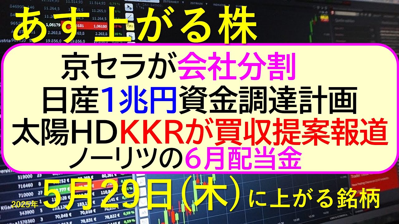 あす上がる株 2025年5月29日(木)に上がる銘柄。京セラが会社分割。日産が1兆円資金調達計画。太陽HDはKKRが買収提案報道。ノーリツの6月配当金~最新の日本株情報。高配当株の株価やデイトレ情報~