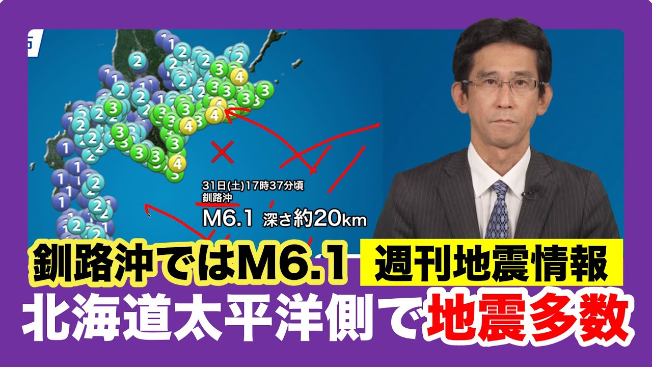 え、1週間の地震についてお伝えする週間 地震情報です。え、まずこちらの図をご覧 ください。こちらは6月1日午前10時 までの1週間に発生した震度1以上の地震 の信源をプロトしたものになります。え、 この1週間ですけれども震度3以上の地震 が6回発生をしました。え、そのうち3回 はですね、この北海道の太平洋側で起きた ものとなります。で、そのうちの1つが こちらです。え、31日土曜日の17時 37分頃に起きた地震です。え、神殿が 串き、マグニチュードが6.1、神玄の深 さがおよそ20kmと推定されています。 え、この地震で北海道の串路市や、浦ロ町 、シ辺茶町、エモ町などで震度4の揺れを 観測した。他、北海道や東北など広い範囲 で、え、揺れを観測しました。この串きを 信とする、え、震度4以上の地震を観測 するのは、ま、去年9月以来のこととなる んですけども、マグニチュード6以上の 地震となりますと、昨年2023年の2月 以来のこととなります。で、この幕代郎機 というのはこちらがですね、太平洋 プレート。置き合いにある太平洋プレート が、ま、陸の下に沈み込んでいる領域に 当たるんですけども、今回の神の深さが およそ20kmとそのプレートの境界に 当たる場所、ま、この辺りです。大体 40kmぐらいという風に、ま、深さ見 られるんですけども、ま、それに比べると かなり浅い場所で起きたということになり ます。ま、プレート教会とは、ま、違う タイプの、ま、地震だったのではないかと 見られます。この白置きですけれども、 こちらが1991年以降のマグニチュード 6クラスの地震の、ま、信源をプロっとし たものになるんですが、地震活動がですね 、大変活発な領域となります。で、この 31日に起きた白置きの地震は今囲った 白い丸が信源となります。この他串きです と大きかったものとしては1993年1月 15日マグニチュー7.5平成5年串地震 と言われます大きな地震が発生をしまして え、視聴者多数を含む大変大きな被害が 発生をした事例あるいは2004年 マグニチュ7.1の地震も、え、この辺り を震源にして起きたような事例があります 。で、この北海道の代表側は置き合いです けれども、過去にはもっと大きな地震です ね。この辺りを信源とする地震としては、 え、2003年のとか千陽地震 マグニチュード8.0ですとかこの辺りを 信源とするものとしては1994年の 北海道東方機地震マグニチュード8.2と いった巨大地震の発生事例もあります。で 、この、え、北海道の、え、太陽画の 置き合いはですね、マグニチュード6.5 以上の地震が2009年以降起きており ません。エネルギーを貯めている可能性も ありますので、ま、今後の地震活動にも要 注意となります。そしてこちらですね。え 、これが26日に発生をしました地方南部 の地震です。え、マグニチュードが5.3 、え、神玄の傘が50kmと見られており ます。え、この地震では北海道の裏川町で 震度4の揺れを観測しています。で、都価 地の南部を信源とする震度4以上の地震の 発生は、え、2019年以来6年ぶりの こととなります。で、この地震も、ま、 釧置沖置沖きと同じく太陽プレートが、ま 、沈み込んでいる領域という風になるん ですけども、先ほどの串置沖きの地震と 違いまして、この深さから考えますと、 この、とかちの地震はそのプレト教会で 起きたものという風に見られます。で、え 、ま、この、ま、北海道ですけれども30 日には北海道東方機でもマグニチュード 5.4の地震が発生するなど、ま、この1 週間で振動3以上の地震が多数発生したと いうことになります。そして最後に海外の 地震です。え、USGSアメリカ地質調査 書が決定したマグニチュード4.5以上の 地震の信源をポロットしたものになります 。え、この1週間ですけれども マグニチュード6以上の地震が5回発生を しました。ま、最も大きかったものは6月 1日、え、ケルマディック諸島金塊で起き たものと6月の、あ、それ5月の30日、 え、アフリカの南性を着て起きた マグニチュード6.2の地震となります。 で、このうちアフリカの置合いの、ま、 地震ですけれども、え、こちらはですね、 北側のアフリカプレートと南側の南極 プレートの教界付近にあたっております。 ま、この辺りも、ま、地震活動が比較的 活発な領域ということになるんですけども 、ま、他の太表の、ま、周辺などと違い ましてですね、この辺りはプレート協会な んですけども、プレート同士が分れる エリアになってると、え、いった点で、ま 、活動に、ま、特徴的なところがあると いうことになります。え、最新の国内の 地震情報ですとか、海外の地震に関する ニュースについてはお天気アプリウェザー ニュースでもご覧いただきます。 [音楽]