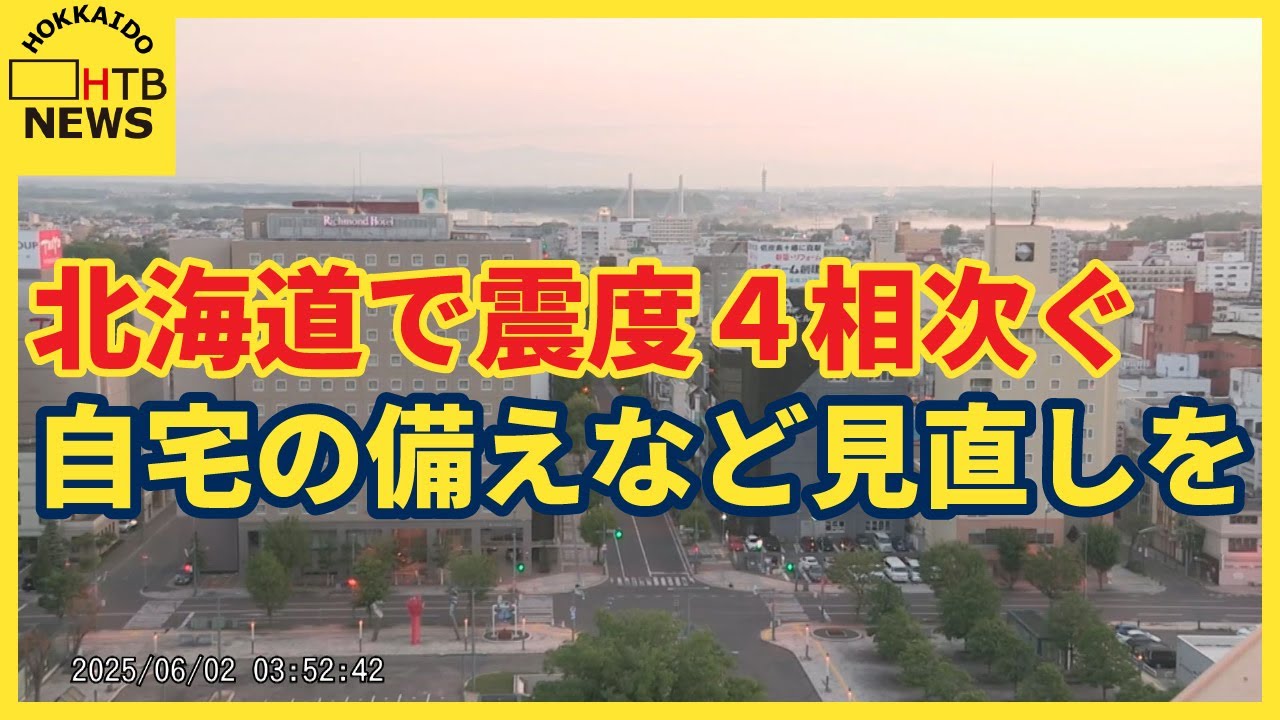 午前4 時前都長とするマグニチュード6.3 の地震が発生し、待機長と裏ホ町で震度4 を観測しました。 なんかの予長なのかなっていう感じはすごいありますね。すごい不安っていうか怖いですよね。 小さい子もいるのでちょっと心配だな。なかなかベビー用品とかまではちゃんと準備してないので、ちょっとその辺に見直そうかなって。 [音楽] 道内ではこの1ヶ月で最大震度4の地震が 相ついでいます。先月15日と中部、23 日裏沖、26日とか南部、昨日の串置 沖置き、そして今朝のとか千置きとこの1 月で5回発生しています。専門家は それぞれの地震に直接的な関係はないもの の、今朝とおいの地震は千島開光に近い ため注意が必要と話します。 これについては、あの、とか千置きから置きにかけての、えっと、ま、いわゆる太平洋プレートに沈み込むところで起こった地震になっておりまして、 国の方では、え、超巨大な地震の発生が、ま、切迫していると、そういう風に評価している地域で起こった地震になります。 [音楽] 島海交沿いでは巨大地震の発生が懸念されていて、専門家はこの機会に改めて備えを見直して欲しいとしています。 北海道の太平洋沿岸では、え、 マグニチュード8から9クラスという非常 に大きな地震がいつ起こってもおかしく ない。え、特にあの津波が来る、え、場所 については、え、避難場所、避難経路の 確認ですね。これを是非お願いできれ