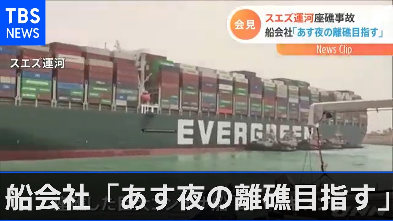 座礁した巨大コンテナ船「エバーギブン」を所有する愛媛県今治市の正栄汽船は26日夕方、会見を行い、これまでに座礁している船首部付近の土砂を取り除く作業を行い、満潮時にタグボート10隻で離礁を試みているものの、いまだ成功していないことを明らかにしました。