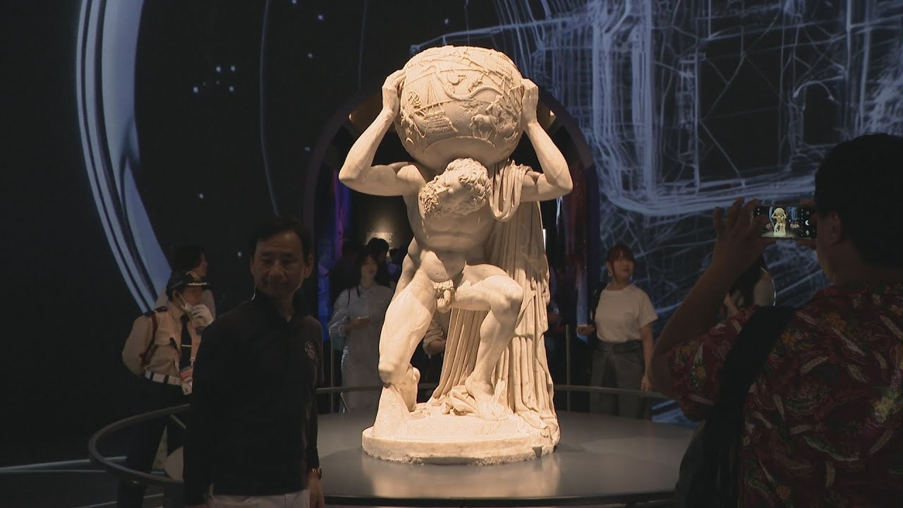 (大石)「きょう(6月2日)はイタリアのマルケ州のPRイベントということで、民族衣装を身にまとった6人の男性たちが、このイタリアの国旗を自在に操っています。待っている人たちも飽きないんじゃないですか」イタリアパビリオンでは、週替わりで国内の各州をPR。週ごとに地域が変わるので、何度通っても違う楽しみ方が出来るのが、魅力です。そして、パビリオンの中に入ってみると…(大石)「『芸術は命を再生する』…映画館のようでしたけど、スクリーンが扉になっているんですね。粋な演出!そして、中に入ると辺り一面の壁が映像になっていますよ。天井を見上げると、これは飛行機の模型ですかね」パビリオンの中心に立っているのは、日本初公開!「ファルネーゼのアトラス」!!西暦150年頃に作られた大理石彫刻で、ギリシャ神話の神・アトラスが天球儀を肩に担ぐ様子が、リアルなタッチで表現されています。まさに“国宝級”の芸術作品です!(大石)「髪の毛一本一本、ひげもしっかり表現されていますね。時を超えて、生命が宿っているようにも感じますね」