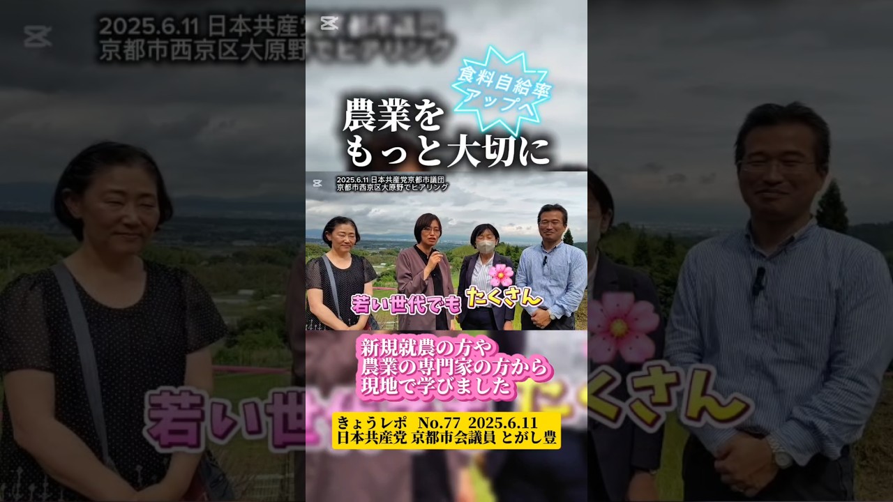 今日はね西教の先の川井洋子議員と議員と森田議員と一緒に その農業についてね 調査に来ようってことで大原野に来ました 本当素晴らしい田野田の景色を見て本当自然の中でね農業に携わりたいていう方が実は京都市の若いえ世代でもたくさんいらっしゃるんじゃないかなという風に実感しましたね ね新規農業をやっておられる方多いって やっておられて私地元ですけど もっともっといろんな方とお話ししたいなと思いました農家の方と京都市がね積極的にねもっと農を活発に盛り上げていくっていう策を打てば新規収納者ももっと増えていくし農業も活発になるんじゃないでしょうか 給食の地産地象でぐらいあのこの地域でだけじゃなくて京都市全員域で滋賀県ぐらいにもちょっと伸ばせばできるんじゃないかなって思いますんで是非資産地象の美味しい安心安全のお野菜を給食で子供たちに提供したいなって思いました あの共産党都市会議員なんでいよいよ農業政策を発表さ はいまいろんな関係者の方にねお話も聞いて勉強もしてきたんで是非形にしていいものを発表したいなと思います 米不足の中ですけれどもやっぱり食料時給率をアップしようと農業を期間産業にしていこうということで頑張りますので黒林あ子と日本共産とよろしくお願いします よろしくお願いします とかあ工芸と