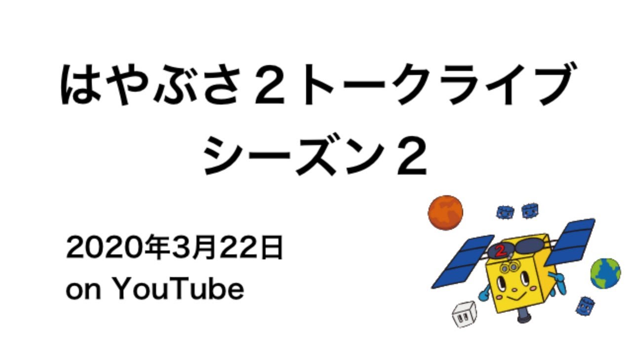 Share Facebook Twitter Pinterest LinkedIn 新型コロナウイルスのために3月に予定されていた「はやぶさ2トークライブシーズン2が延期になってしまいましたので、ネット中継でトークライブを行います。是非、ご覧ください。 テーマ :「はやぶさ2」で分かったサイエンスの最新情報 講師 :荒川政彦(神戸大学)、岡田達明(JAXA) 司会 :吉川真(JAXA) 10万分の1