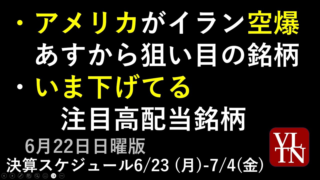 アメリカがイラン空爆、あすから狙い目の銘柄。いま下げてる、注目高配当銘柄。決算スケジュール2週間分。6月22日日曜版。~あす上がる株。最新の日本株情報。高配当株の株価やデイトレ情報も~