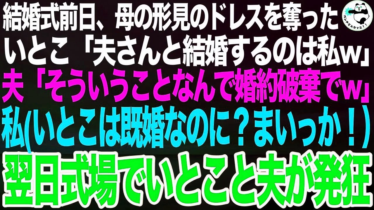 結婚式前日、母の形見のウェディングドレスを奪っていったいとこ「夫さんと結婚するのは私w」夫「そういうことだからw」私(いとこは既婚なのに?ま、いっか!)➡翌日、式場でいとこと夫が発狂