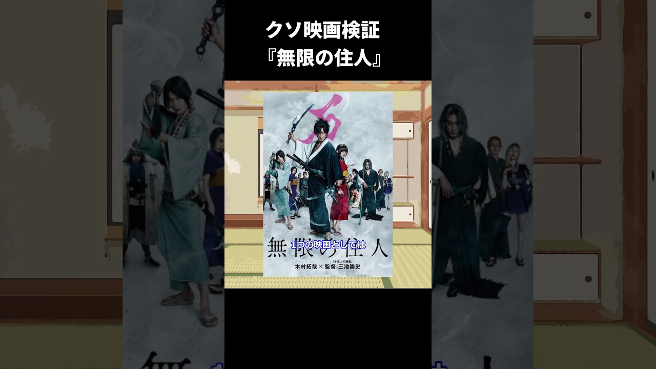 松本13チャンネルゆっくり映画雑談今回 はクソ映画検証無限の住人についてです この映画一部では爆死した打作みたいな 扱いをされていますが実際はそこまで悪く ない映画かと思います確定的な情報はあり ませんが少なくとも制作費の回収はできて いる模様です評価についても高評価多数と はいかないながらも肯定的な評価もそれ なりにありましたただ人気漫画の実写化 作品無託主演作品としてはかなりの不審で はあるかと大爆や大家などの表現について は大げさかもしれませんが期待からの楽さ を考えるとこれらの表現も全くまと外れと いうわけではないかと思いますでは実写か 映画としてはどうなのかという部分個人的 に無限の住人に関しては過去2回アニメ化 された作品を見ている程度ですアニメを見 て面白かったら原作漫画も読んでみる みたいなパターンも多あるのですが程度の 違いはあれどちらのアニメシリーズも個人 的にはそこまでの大傑作というわけでは なかったので原作漫画を読み込むまでとは いきませんでしたなので原作の全てを知っ ているというわけではないのですがある 程度の世界観や基本的なストーリーは把握 はしています原作漫画を読み込んだガチの ファン目線ならまた評価は違うかと思い ますが一部では見る価値なしの打作よくて もまあそれなりの作くらいの評価である アニメ作品に比べると今作実写化としては そこまで悪くはないんじゃないかとむしろ 近年の三池孝志監督作品の中ではかなり いい方なんじゃないかと確かにこの作品を つまらないという人の気持ちは分かるの ですがただアニメに限って言うと原作も そこまで面白くないんですよね今作におけ るストーリーの格となるリの復習撃やそれ らに関する限動についてのツッコみどや ちょっとあれな部分に関しても別に実写に 限ったことではなくアニメでも同様だっ たりするのでなので実写か作品である今作 ならではのツッコミどって個人的には あまりなかったり1つの映画としては ちょっと微妙な部分はあるもののとはいえ そこまでぶち抜けた打作というわけでも なく主演であるキム補正さえあれば結構な 要作になった可能性もあるかと思うのです がそこまでの大傑作ではないものの本来 ならば工量的にも非にももう少し高かった のではないかとただ今作が公開されたのは 解散直後真層の全てが明らかになっている わけではないので確定的な情報ではない もののただ今作の主演であるキム卓が スマッ騒の原因の1つとなったことは おそらく間違いがないわけで特にスマッ算 直後であるこの時期はキム卓への逆風って 本当に半端なかったと思うんですよね そんな色々とあるご時世のキ卓主演作 アニメに関しては微妙な原作近年はかなり 当たり外れが多くなおかつクソ実写と表さ れる作品を何本も世に放ってきた前下の あるミ孝監督作品この映画の構成要素を 知れば知るほどこの映画を一体誰が見るの だろうといったところにも関わらずこの 映画大けはしなかったのだからその部分は 素直にすごいと思うのですが諸々の逆風を 踏まえてもなお最低限の面は保った今作 おそらくスマッ解散さえなければこの映画 キム卓主演策としても三池孝志監督作品と しても成功の部類には入ったんじゃないか と個人的な結論としては決して作ではない もののダ作まではいかないかなとクソ映画 では絶対ないかなとただ公開時期が悪かっ ただけに自由やムードで必要以上に評価が 押し下げられてしまった不便な作品といっ たところですというわけで今回はこの辺で 最後までお付き合いいただきありがとう ございました [音楽]
