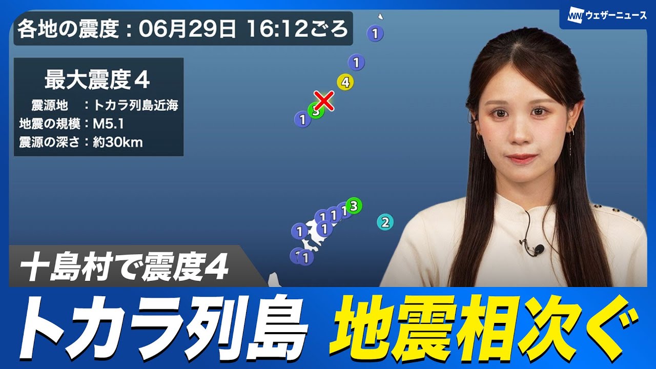 【地震情報】トカラ列島近海で地震相次ぐ M5.1の地震 十島村で最大震度4 /津波の心配なし