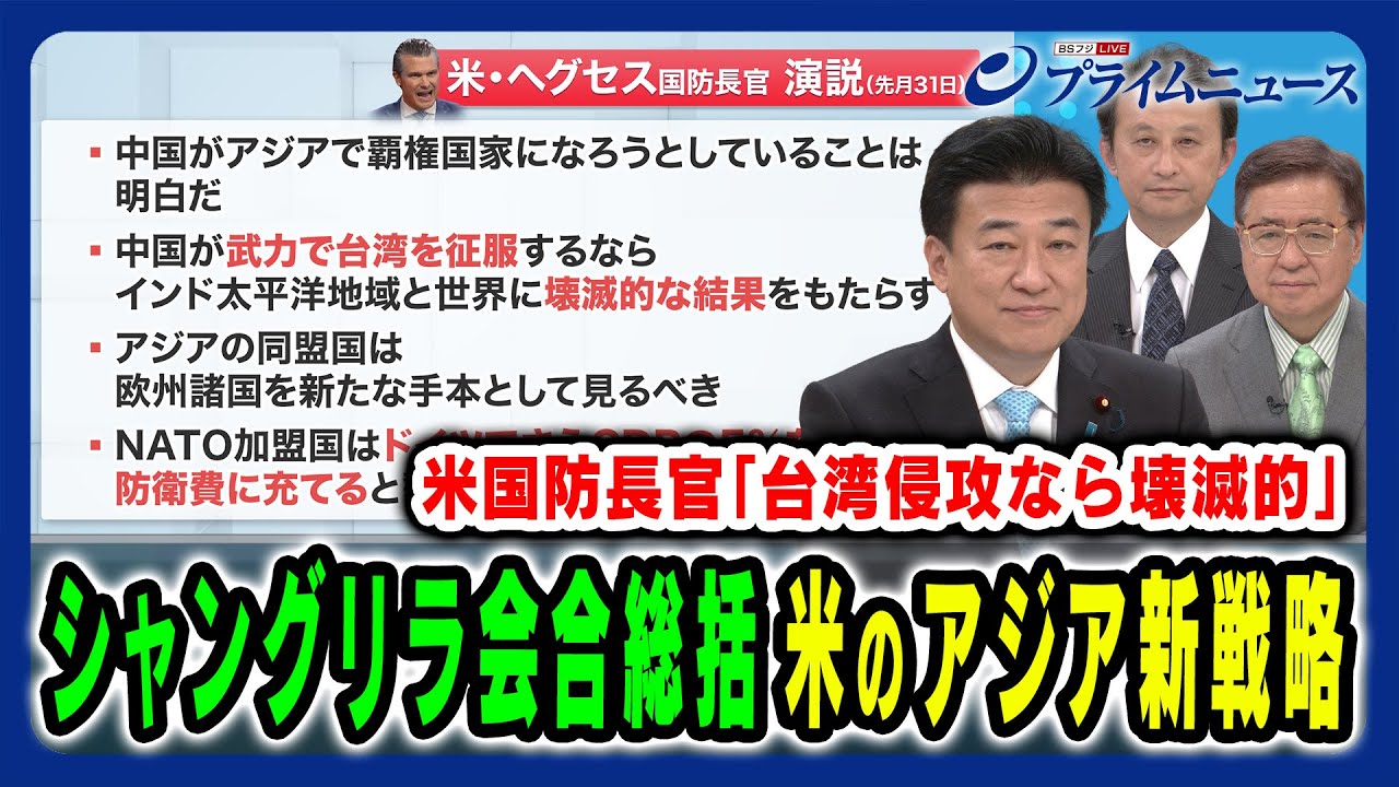 [音楽] こんばんは6月2 日月曜日のプライムニュースです 今夜のテーマはこちら木原全防衛大臣に問うトランプ政権の体中戦略とアジア地域の安全保障ですゲストをご紹介します番組に初めてのご出演となります 全防衛大臣で自民党安全保障調査会長の木原みさんですよろしくお願いいたします よろしくお願いします 元国家安全保障局長の金原信勝さんですよろしくお願いいたします よろしくお願いします そして中国やアジア太平洋の安全保障政策がご専門の佐川平和財団石フェロー小原本司さんですよろしくお願いいたします よろしくお願いします 今年で22回目の開催となるアジア安全 保障会議通称シャングリラ開合が シンガポールで行われましたシャングリラ 介合とはアジア太平洋地域を中心に各国の 防衛国防省らが集まり安全保障を巡る課題 を話し合う世界でも最大級の安全保障会議 ですイギリスのシンクタンクIIS国際 戦略研究所の主催で5月30日から3日間 にわって開催されましたフランスからは マクロン大統領がアメリカからはヘグセス 国防長官が日本からは中谷防衛大臣が そして中国 の軍国防省は欠ました 木原さんは去年防衛大臣としてシャングリラ介に参加されたわけですがこのシャングリラ介の重要性というのはどうぐらいになっていますか そうですねまあのこの地域アジア地域の中で行われるこの手の開合としては最重要かつ最大規模 の会議であの日本政府としてもま防衛省としても非常に重要をしてるところです で私も去年参加をさせていただきました けども私防衛大臣中は30カ国の国防大臣 と倍で会談をしたわけですけどもそのうち の約半数のですね14カ国はこの シャングリラ介のいわゆるサイドでえま倍 会談なりマルチ会をしたというぐらいです ね各国のそう国防大臣が集まって一度に 返してえそれを機械にいろんな話し合いを するというそういう意味で非常に重要だ と思ってますうん で今回最も注目を集めたのはあのやっぱりえこのヘグ防長官のですねあの演説ではなかったかなという風に思ってますで実際にですねあのコルビーさんがこのヘグセス官の演説の直後にですねご自身のえ Xを 更新してそしてえこういうコメントしてます 長官はトランプ大統領の顧問センス常識である力による平和がインド太平洋における米国の政策にとって何を移民するかを明確にした という風に投稿をしておいます おそらくこれあのコルビー え国防時間と連携を取りながらやってたんじゃないかなと思いますがまさにトランプ政権のインド代表戦略の輪郭とかあるいは同盟国やパートナー国への要求を読み解く上で非常に重要なスピーチだったかなと思います ヘグセス国防長官の演説のポイントを まとめました 中国がアジアで派遣国家になろうとして いることは明白だ中国が武力で台湾を制服 するならインド太平洋地域と世界に壊滅的 な結果をもたらすアジアの同盟国は ヨーロッパ諸国を新たな手本として見る べきあ藤加国はドイツでさえGDPの5% を防衛費に当てると制約ということで金原 さんこの2つ目のポイントなんですが中国 が武力で台湾を制服するならインド太平 洋地域と世界に壊滅的な結果を もたらすとか強い言葉で表現したわけです がこれについてはどうご覧になっています か台湾がですねあの全盛紀のに民主化 しちゃったもんですから共産主義嫌いだっ たポンてちゃったんです ね今に入 がもうすごく強くなってですねやれるかもしれないなってしまったので リアルなんですよ台湾の友事の話が で世界1の経済のアメリカとですね2 の中国と3 回の日本とですねであとG20 サイズの大きさがあるんです台判っていうのは ここでまひょっとして韓国が入ってくるとですね第 3 世界の大きな戦争になるんです経済も壊滅しますし会も止まりますしですねあ最後戦争になれば爆弾しるわけですね人もいっぱい死にますしこのスケールが分かってますよね ということでやめなさいよっていうことなんですよねで案外あの台湾戦争ってローカルの戦争と思ってる人が多くてですね大戦争になるんですだからやらちゃいけないっていうこともはっきり言ったということだと思いますね [音楽] 今このタイミングでこれを述べる狙いというのはどうぐらいになってますか この10 年なんです中が強くなったのはだ台湾友のですねリアリティが分かってない人が多いんですよこれ解明的な戦争になるぞとやらちゃいけないんだということを一生懸命言ってるんだと思いますけどね 木原さん今の話どう聞きになりますか そうですねあのスピの冒頭でですねあの ヘグセスはあの私の仕事はということで 自分の仕事を定義付けていましてトランプ 大統領のために意思決定の余地を作り維持 することであるというすなわちえトランプ 大統領のための選択肢をですね準備すると いうようなことをあのおっしゃってます そしてえまあの国防省の米軍ですねの任務 というのは中国が誤った選択し選択をし ないようにまえ