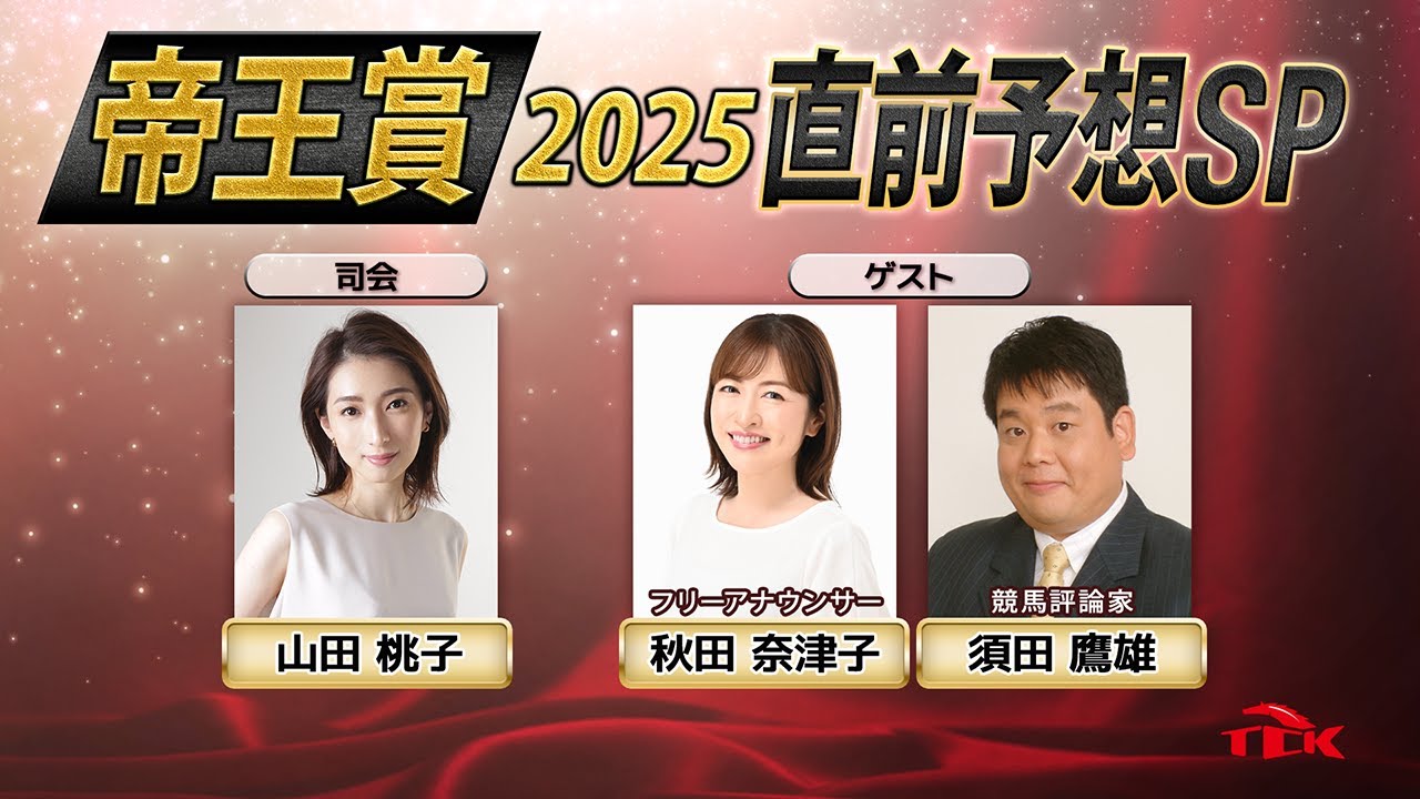番組では、司会に南関キャスターの山田桃子さん、ゲストにフリーアナウンサーの秋田奈津子さん、競馬評論家の須田鷹雄さんをお迎えし、帝王賞を徹底的に分析し予想します。
