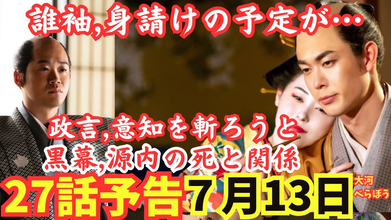 【大河べらぼう】7月13日,27話回ネタバレ予告,誰袖の身請けで意知と結ばれるはずが政言の恨みで斬りかかる黒幕武士が政言に吹き込む,平賀源内の死と関係ある!?/佐野政言/矢本悠馬ドラマあらすじ