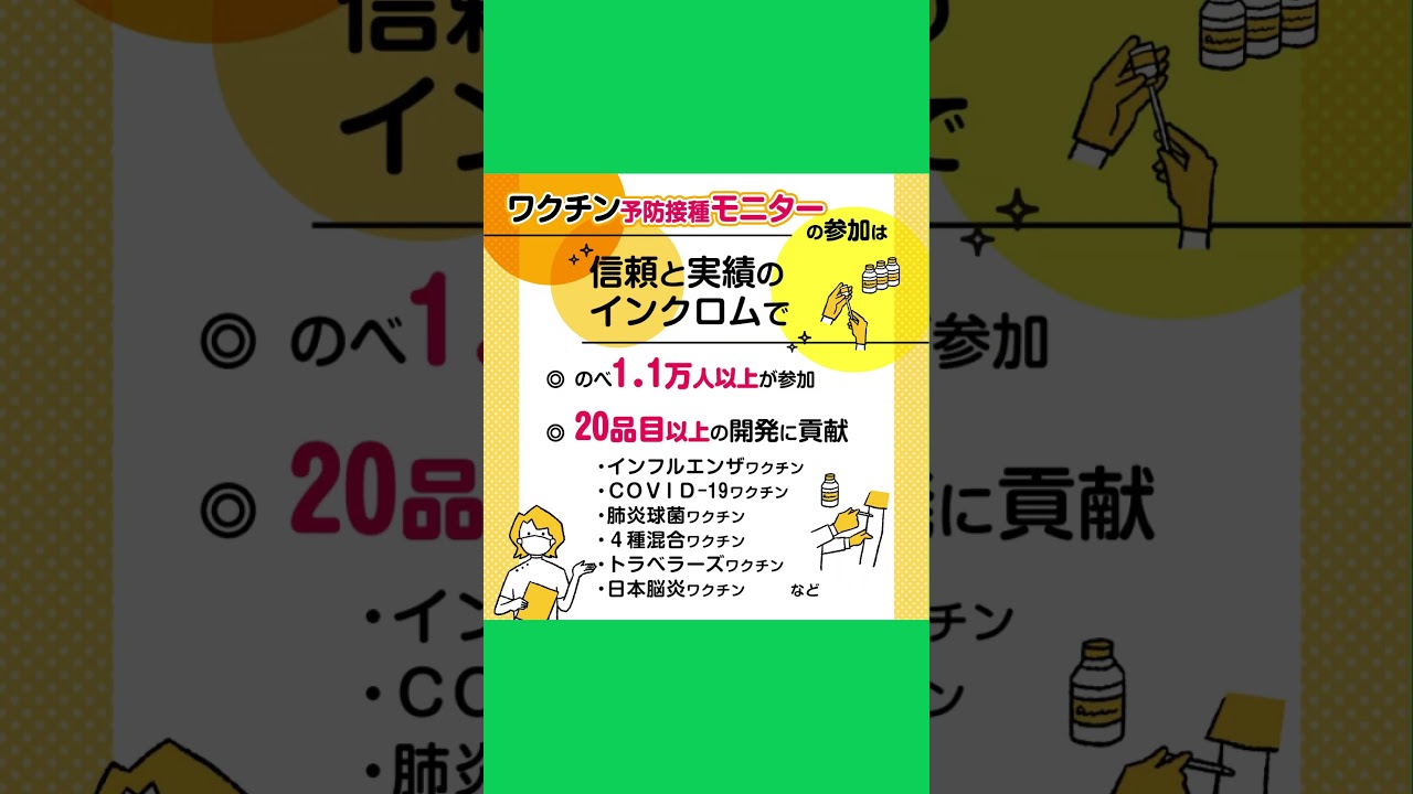 社会貢献に興味があるけど何から始めれば そんなあなたにワクチン予防摂取モニター のご案内ですインクロムではこれまでのべ 1万人以上の方にご協力いただき目 以上のワクチン開発に貢献してきました 無料会員登録後興味のある案件に申し込む だけ1回のごLINEにつき約1万円の 協力費が支払われます参加はご自身の意思 で自由に選べて安心あなたの協力が誰かの 未来を守る力になります詳細は ウェブサイトをチェック
