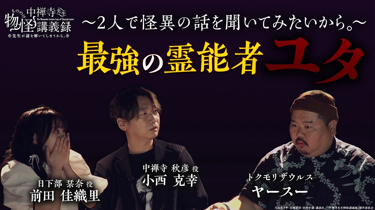 あの漫画読んでください いや是非もうね すませんありがとうございます もう大ファンよもう本当に気になる ということでありがとうございましたございます はいということでえ今日は安さんに怪談話をご披露いただきましたが私演じるかなちゃんとそして小西さん演じられる中前先生そして江えの木ずさんや他のメンバーが様々な会や事件に立ち向かっていくテレビアニメ前寺先生物のけ講義録先生が謎を解いてしまうからは現在放送中です引き続き作品をお楽しみください はいよろしくお願いします見てください お願いします ということで以上草壁館の役前田香と 中前寺明彦役小克と 安でした